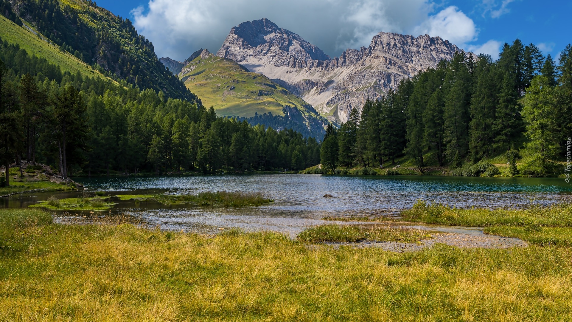 Edytor tapety: Góry i lasy nad jeziorem