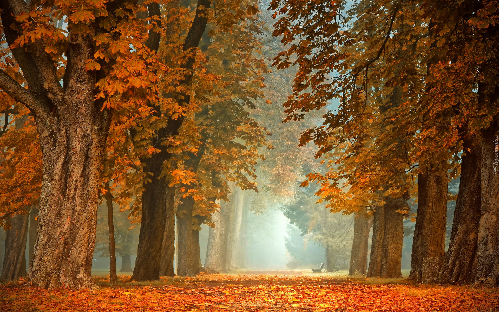 Edytor tapety: Kasztanowce z pożółkłymi liśćmi w parku