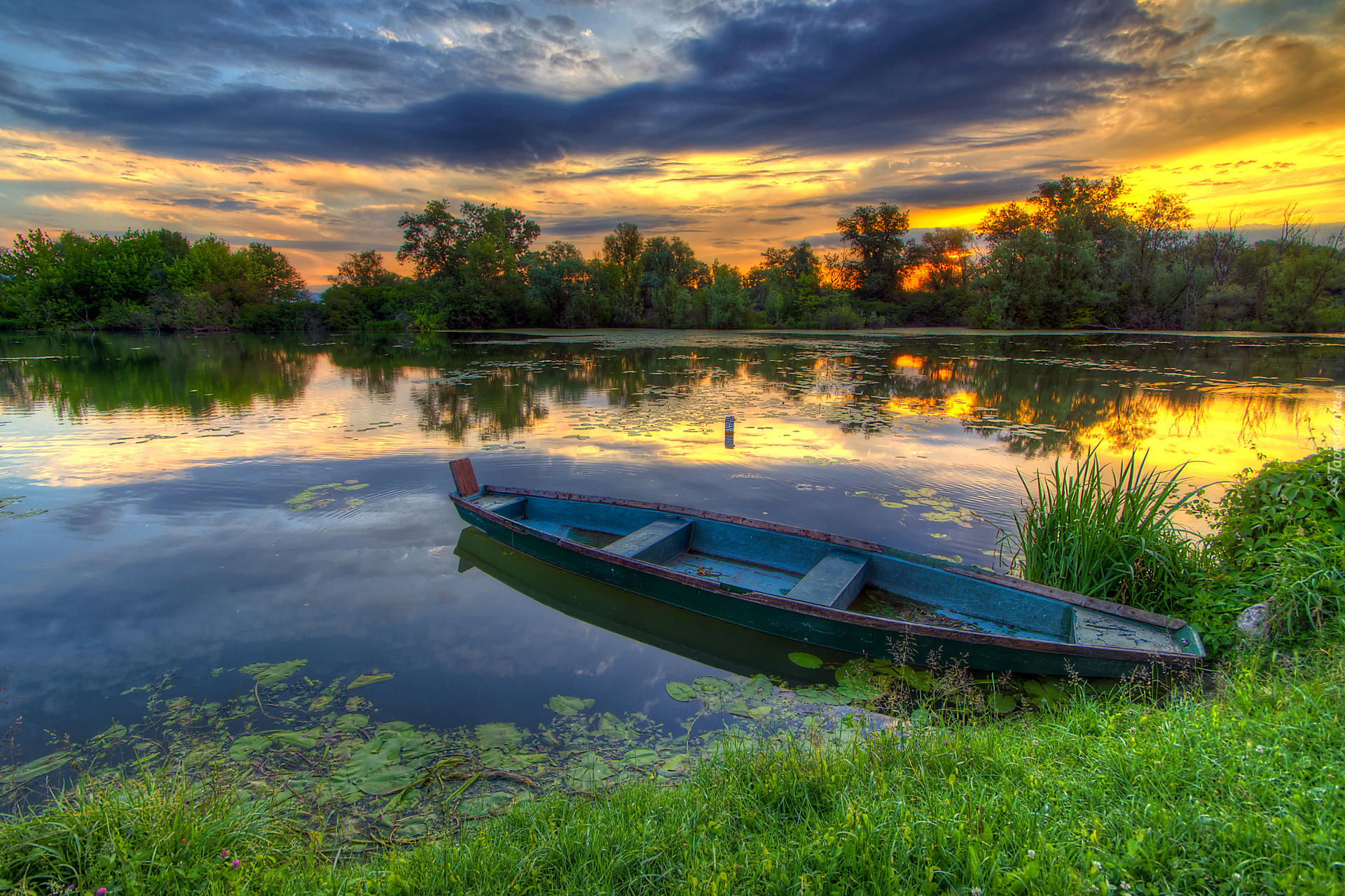 Edytor tapety: Łódka na trawiastym brzegu jeziora