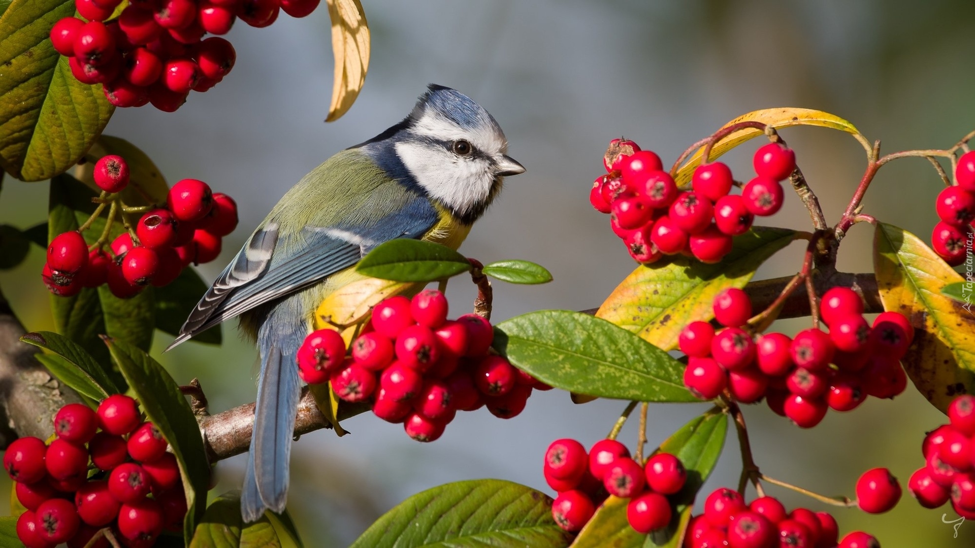 Edytor tapety: Modraszka zwyczajna na gałązce ognika szkarłatnego