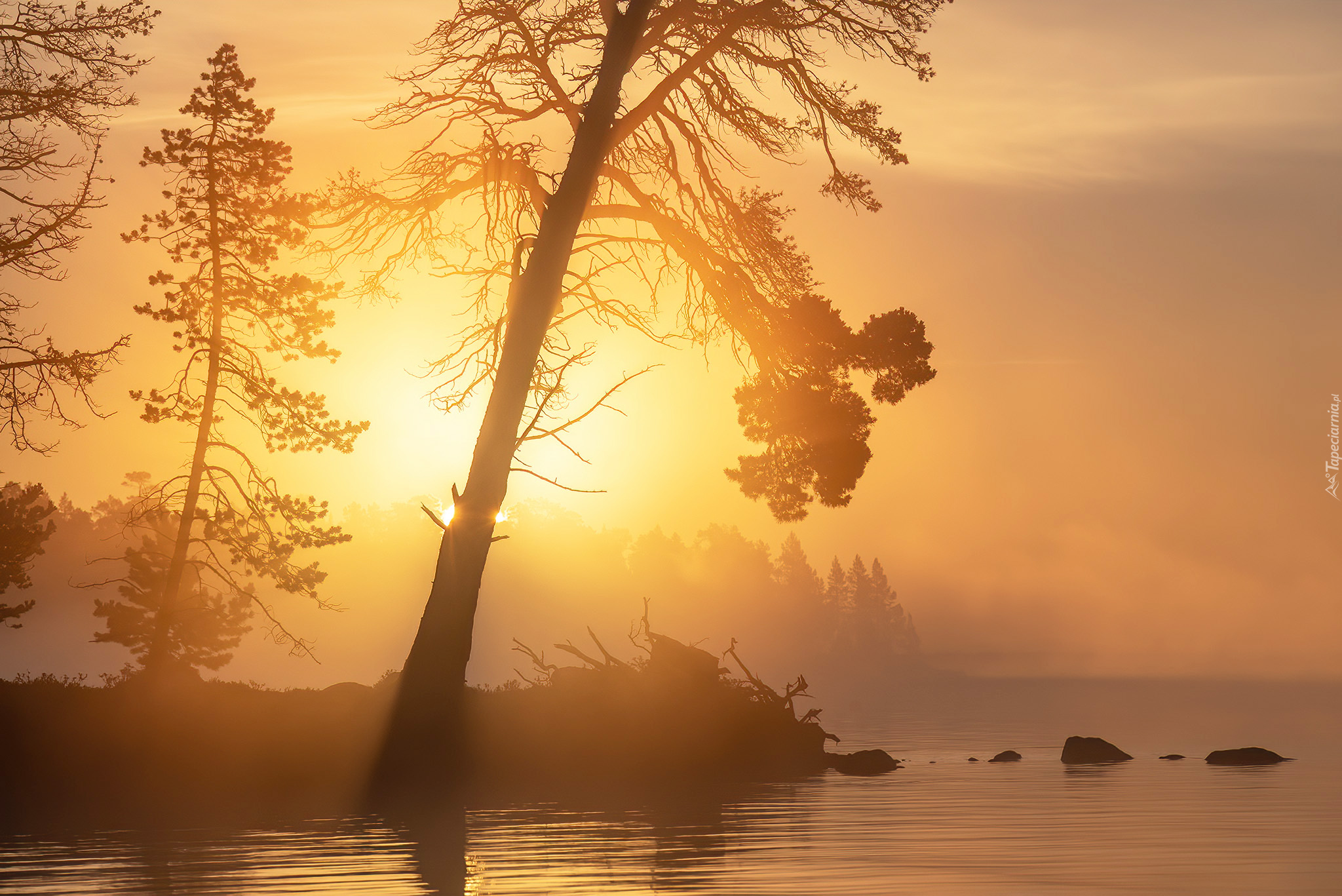 Edytor tapety: Drzewa w promieniach porannego słońca na brzegu jeziora