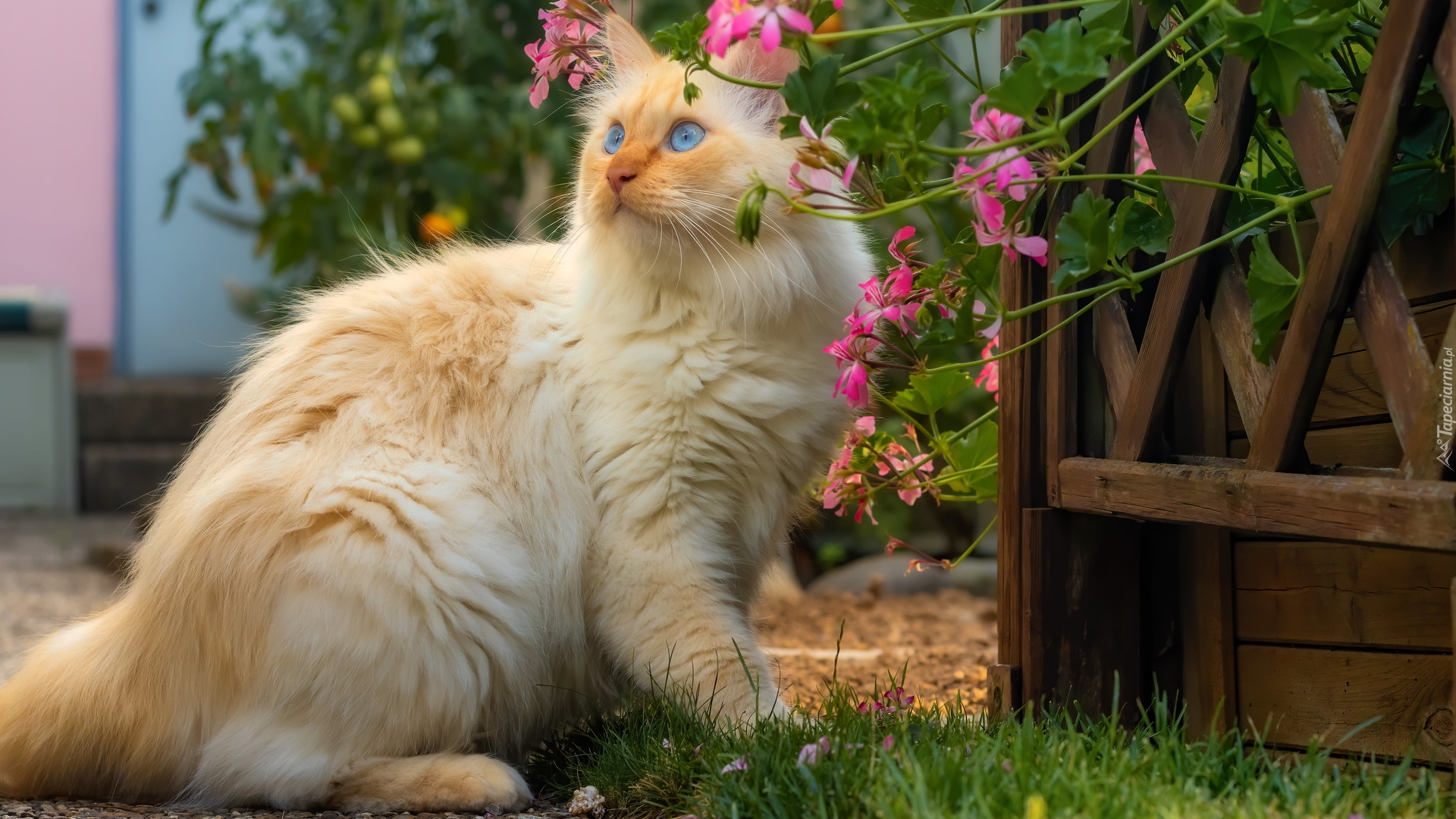 Edytor tapety: Niebieskooki kot pod kwiatami pelargonii