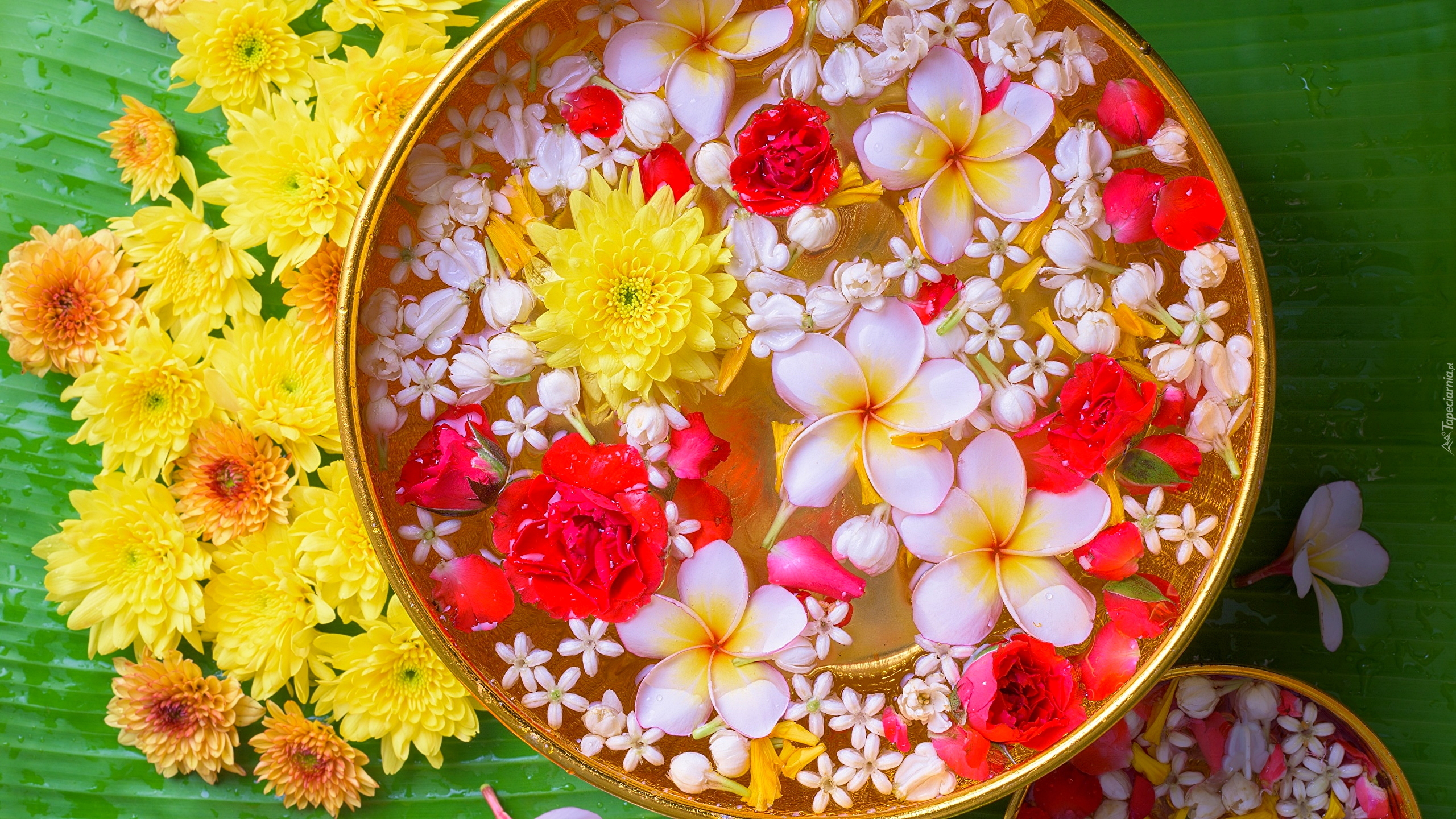 Edytor tapety: Chryzantemy i plumerie w miseczce z wodą