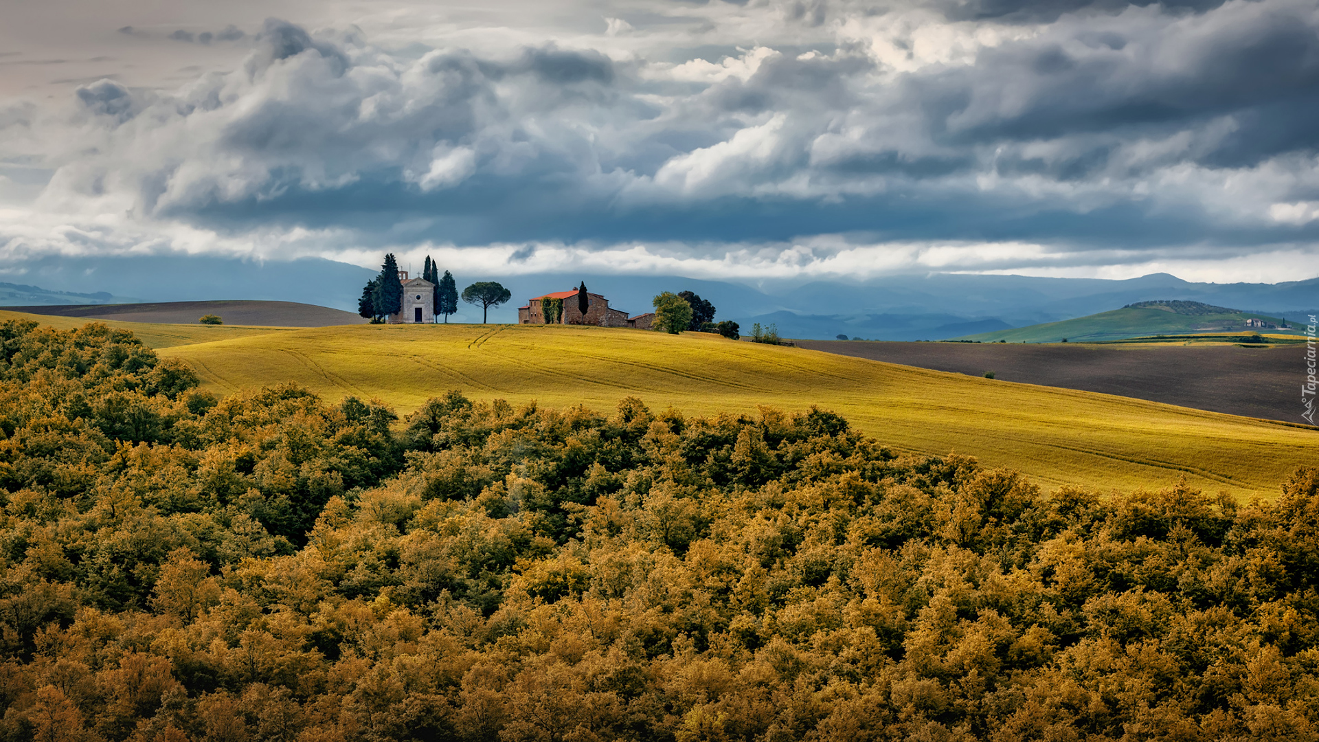 Edytor tapety: Jesienne drzewa i dom na wzgórzu w Toskanii
