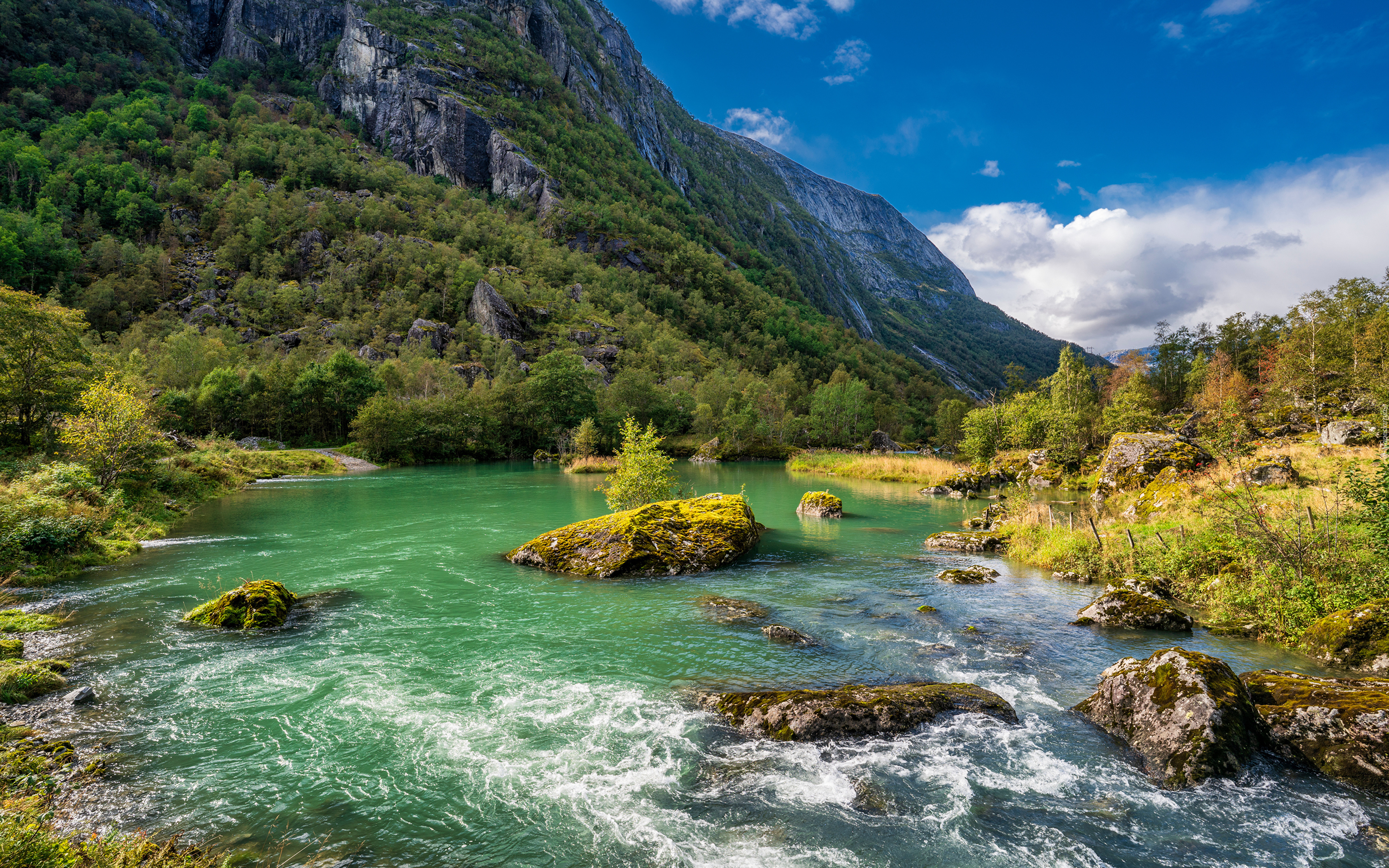 Edytor tapety: Kamienie w rzece z widokiem na góry
