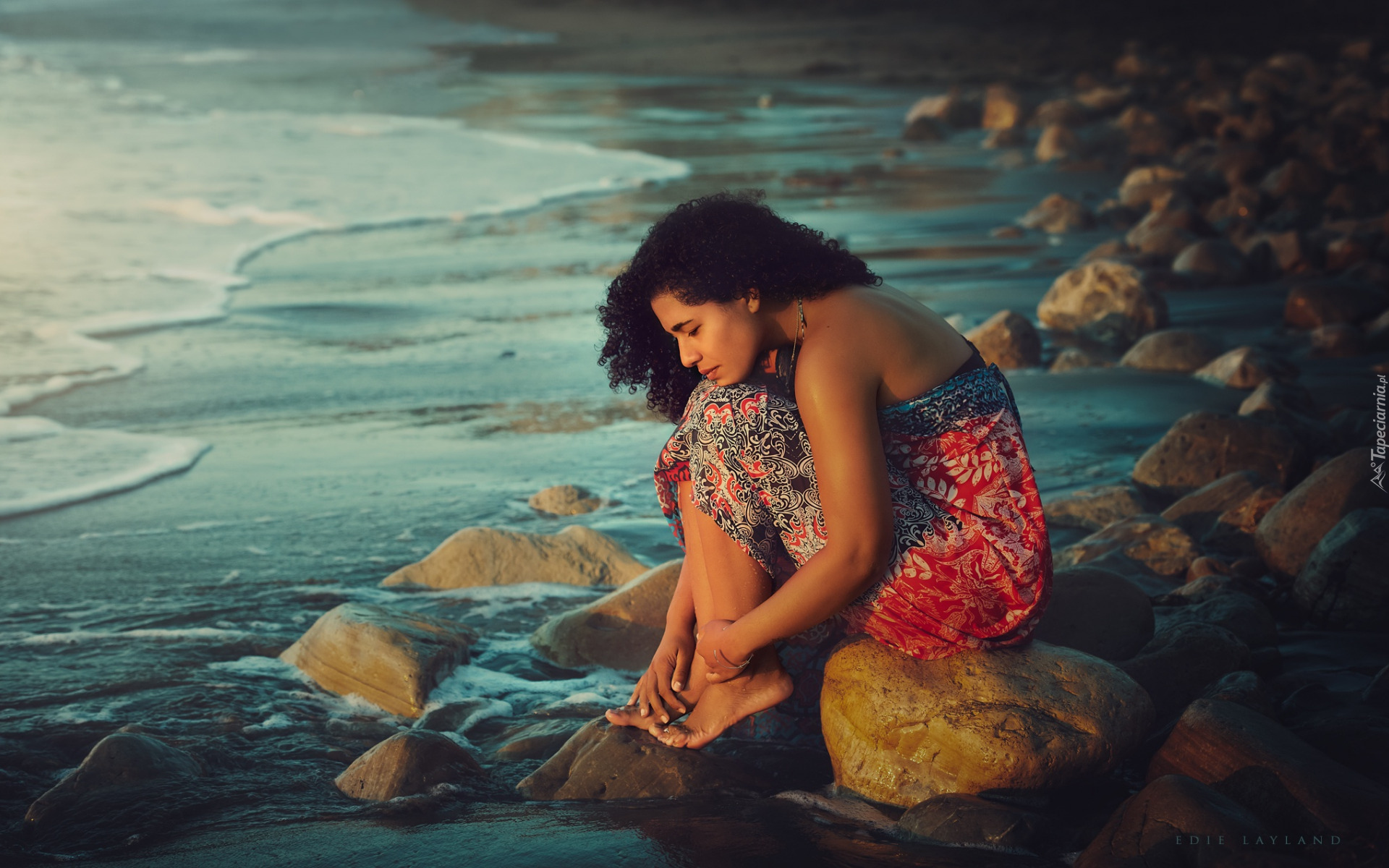 Edytor tapety: Kobieta siedząca na kamieniu na brzegu morza