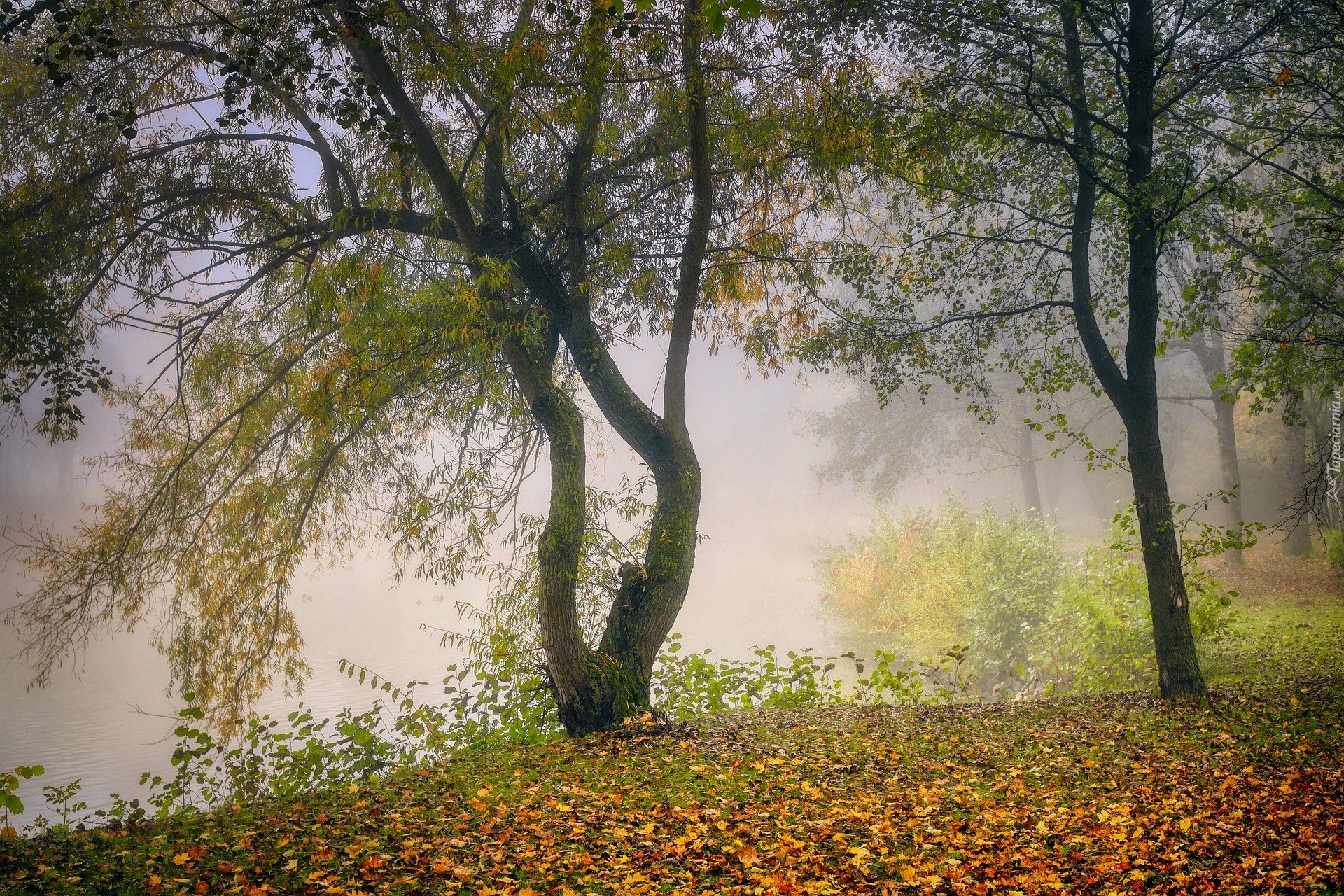 Edytor tapety: Opadłe liście pod drzewami nad zamgloną rzeką