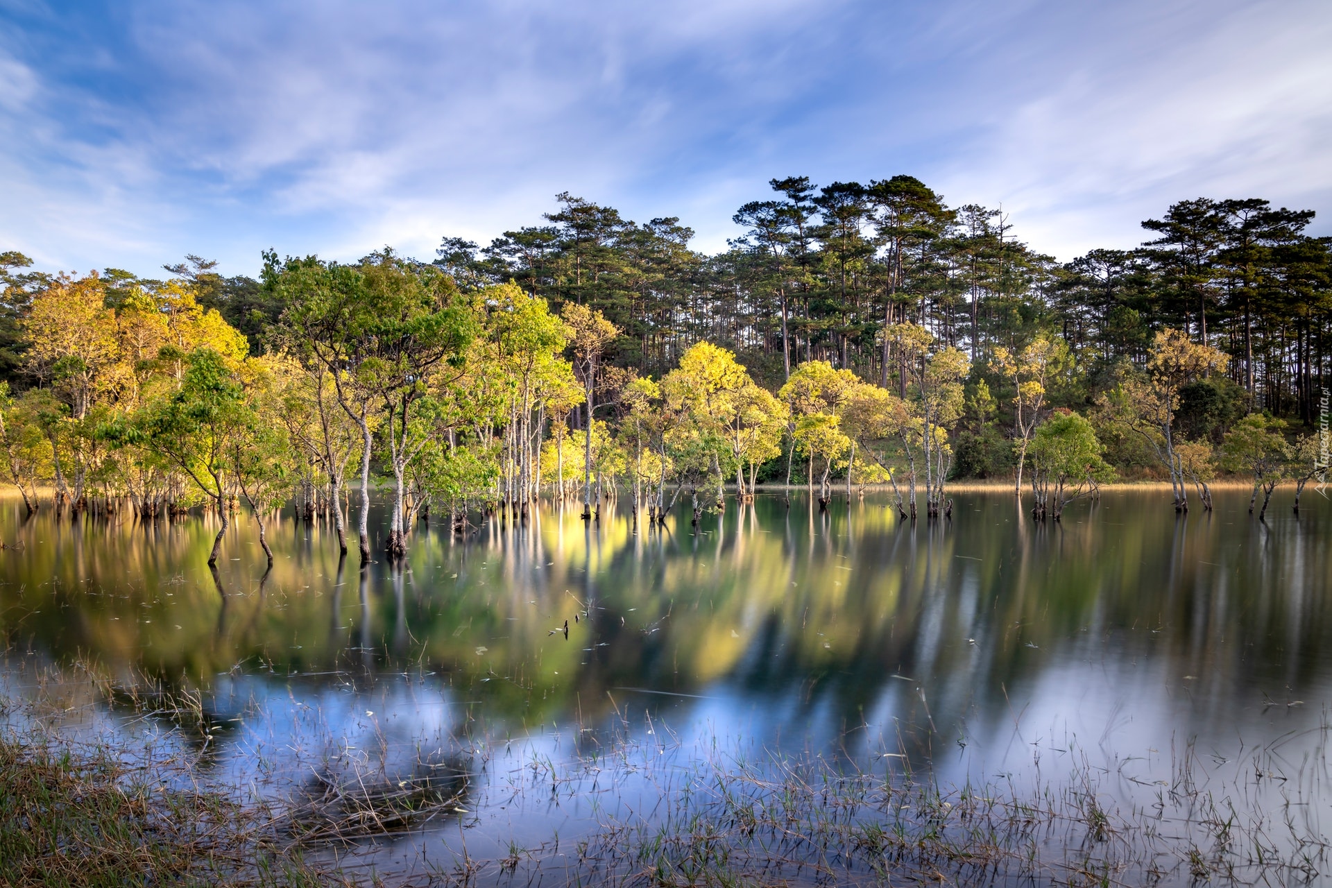 Edytor tapety: Odbicie jesiennych drzew w jeziorze