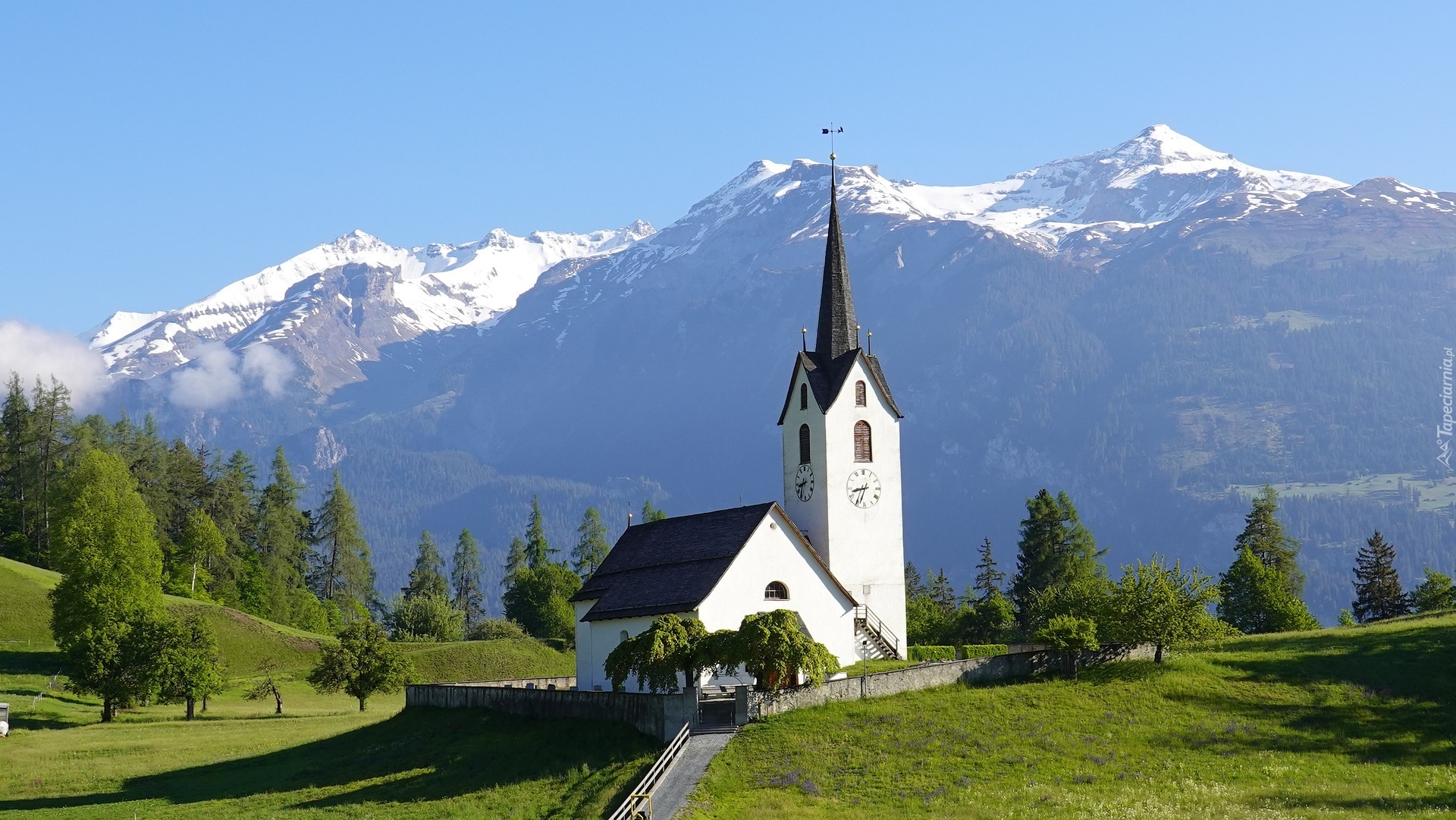 Edytor tapety: Biały kościół na tle gór