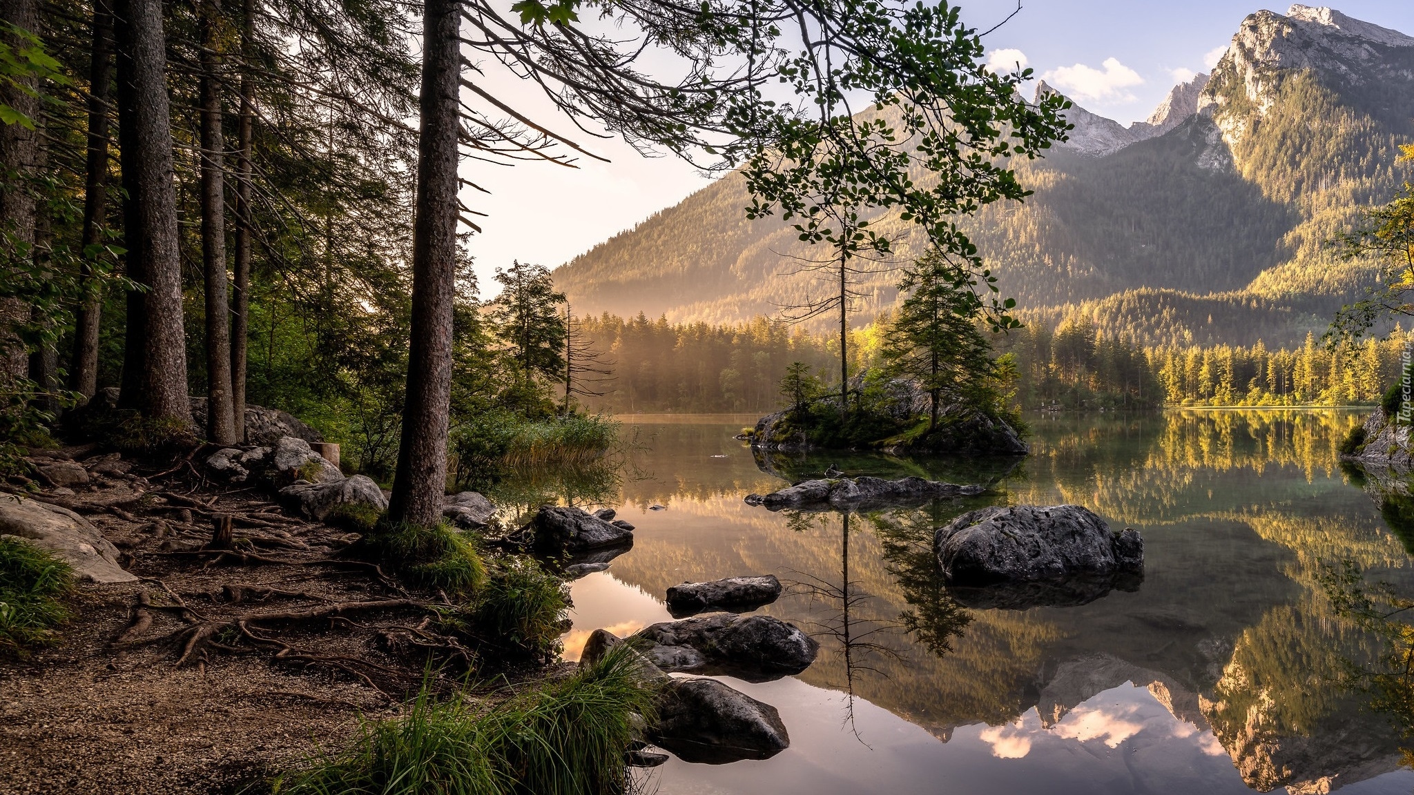 Edytor tapety: Drzewa na brzegu jeziora Hintersee