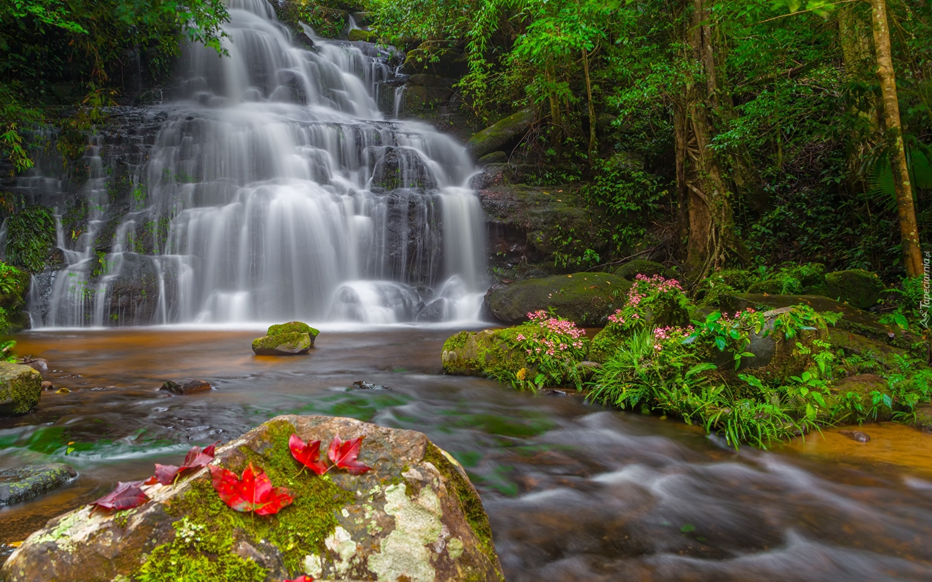 Edytor tapety: Zielone drzewa obok wodospadu na skale