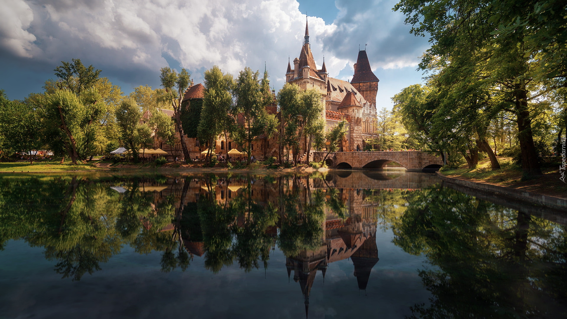 Edytor tapety: Zamek Vajdahunyad nad stawem w Budapeszcie