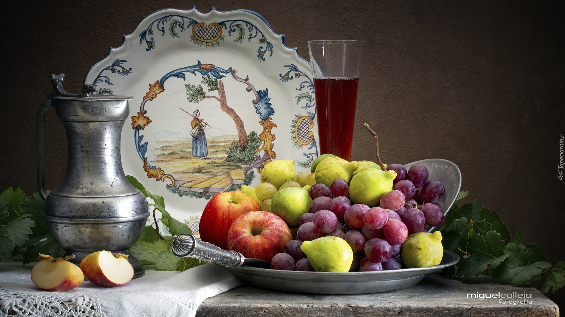 Edytor tapety: Owoce obok ozdobnego talerza i dzbanka