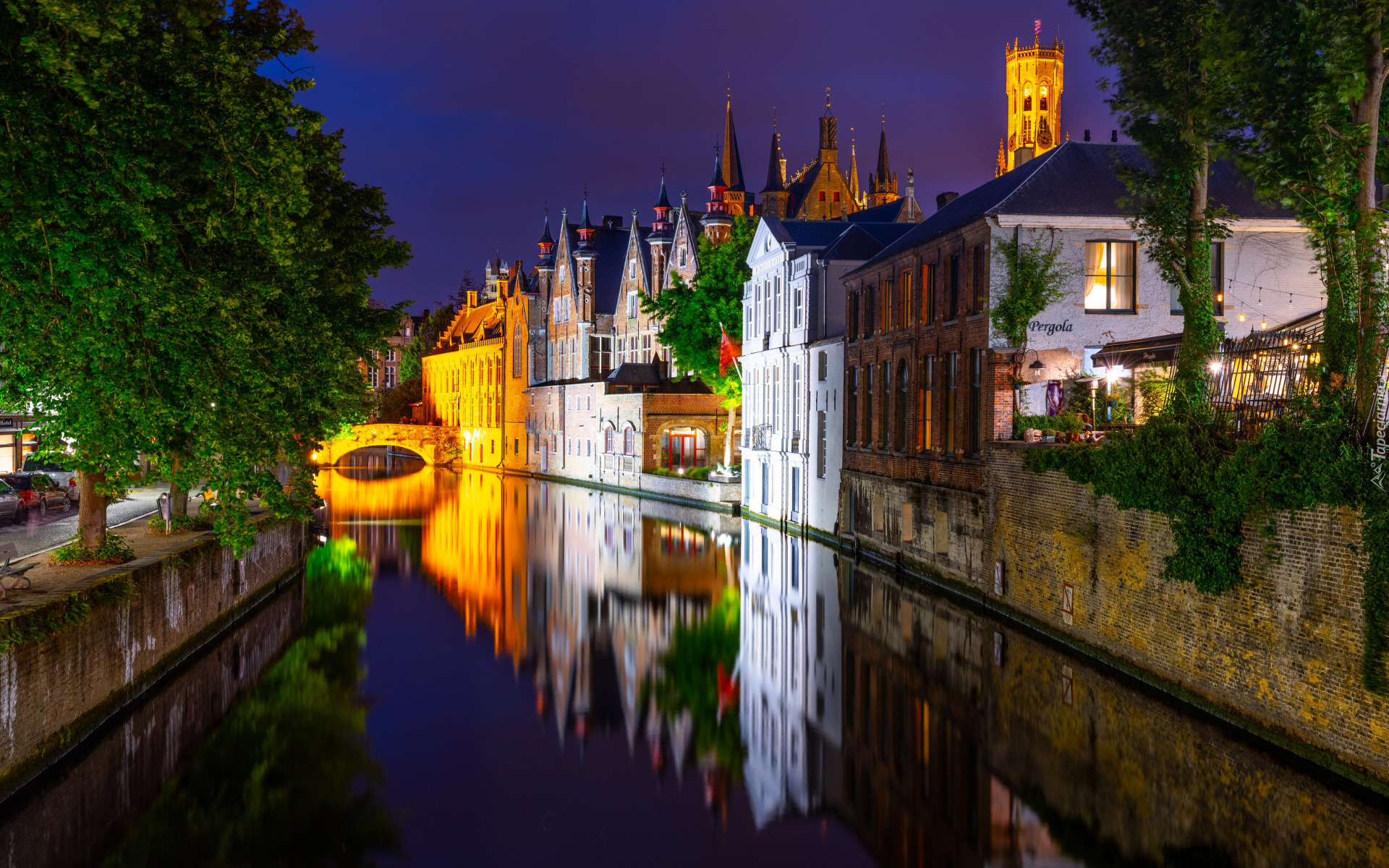 Edytor tapety: Oświetlone domy i most nad kanałem w Brugii