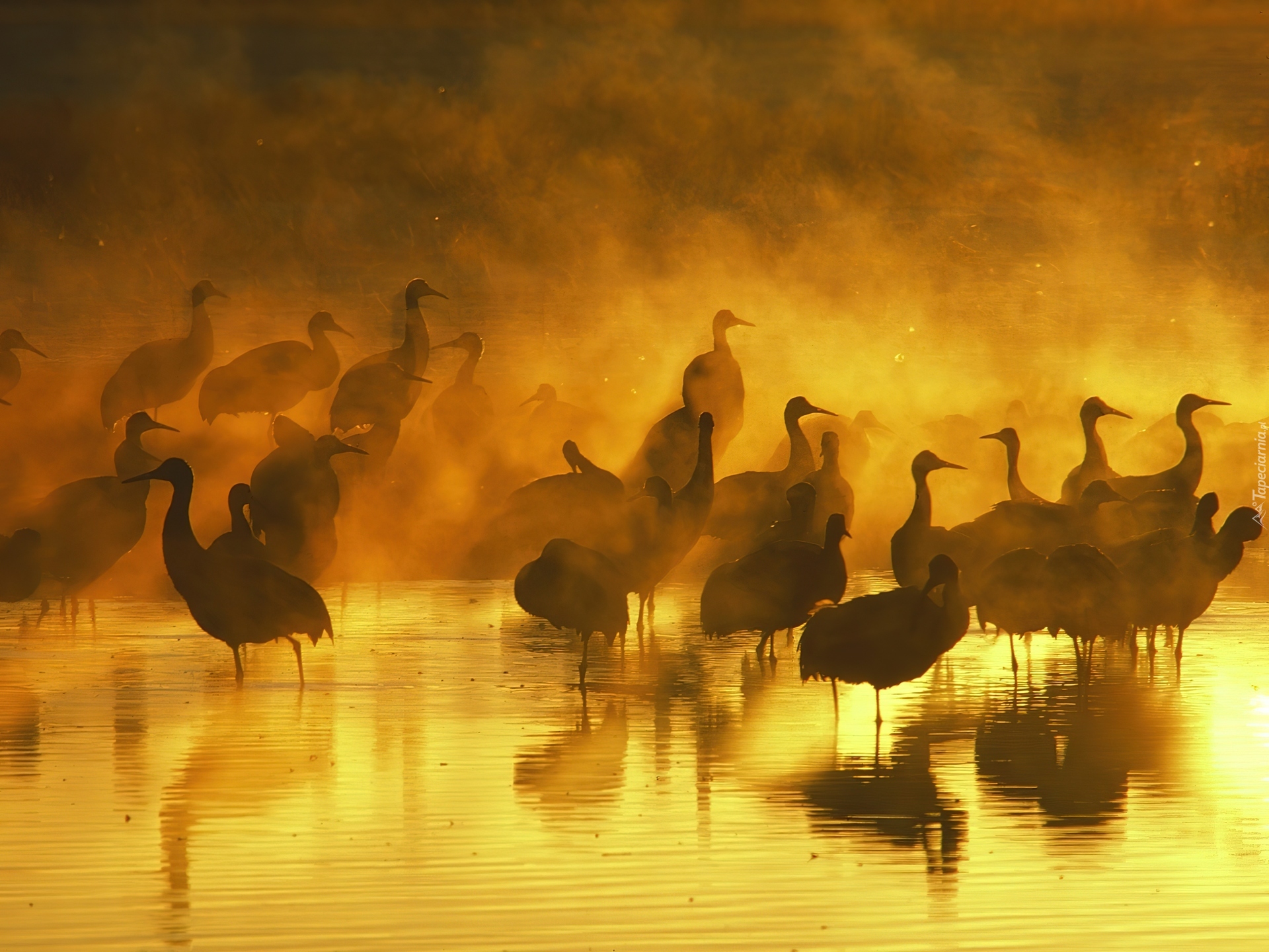 Edytor tapety: Żurawie, mgła, woda, jezioro