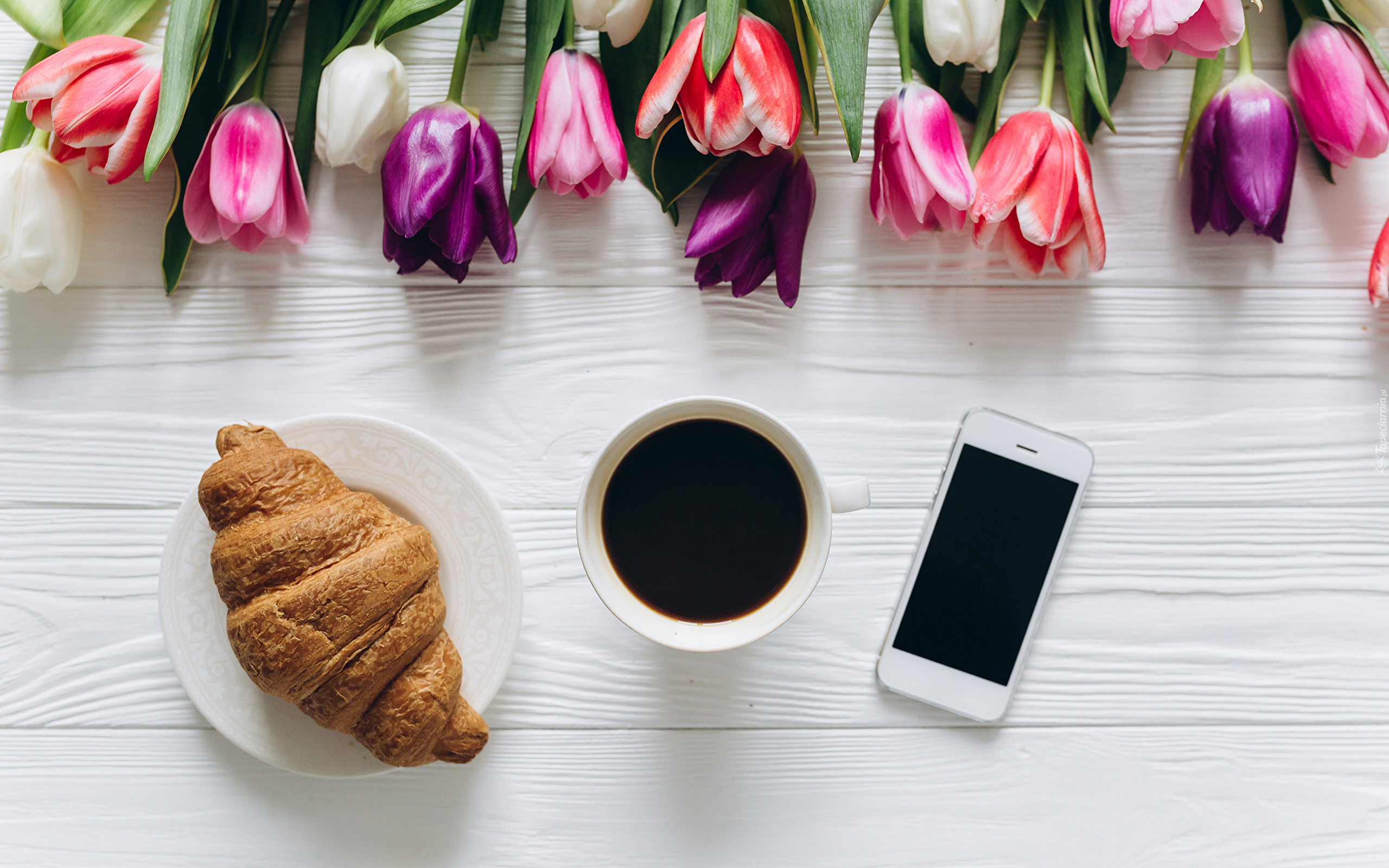 Edytor tapety: Kawa obok rogalika i telefonu oraz tulipanów