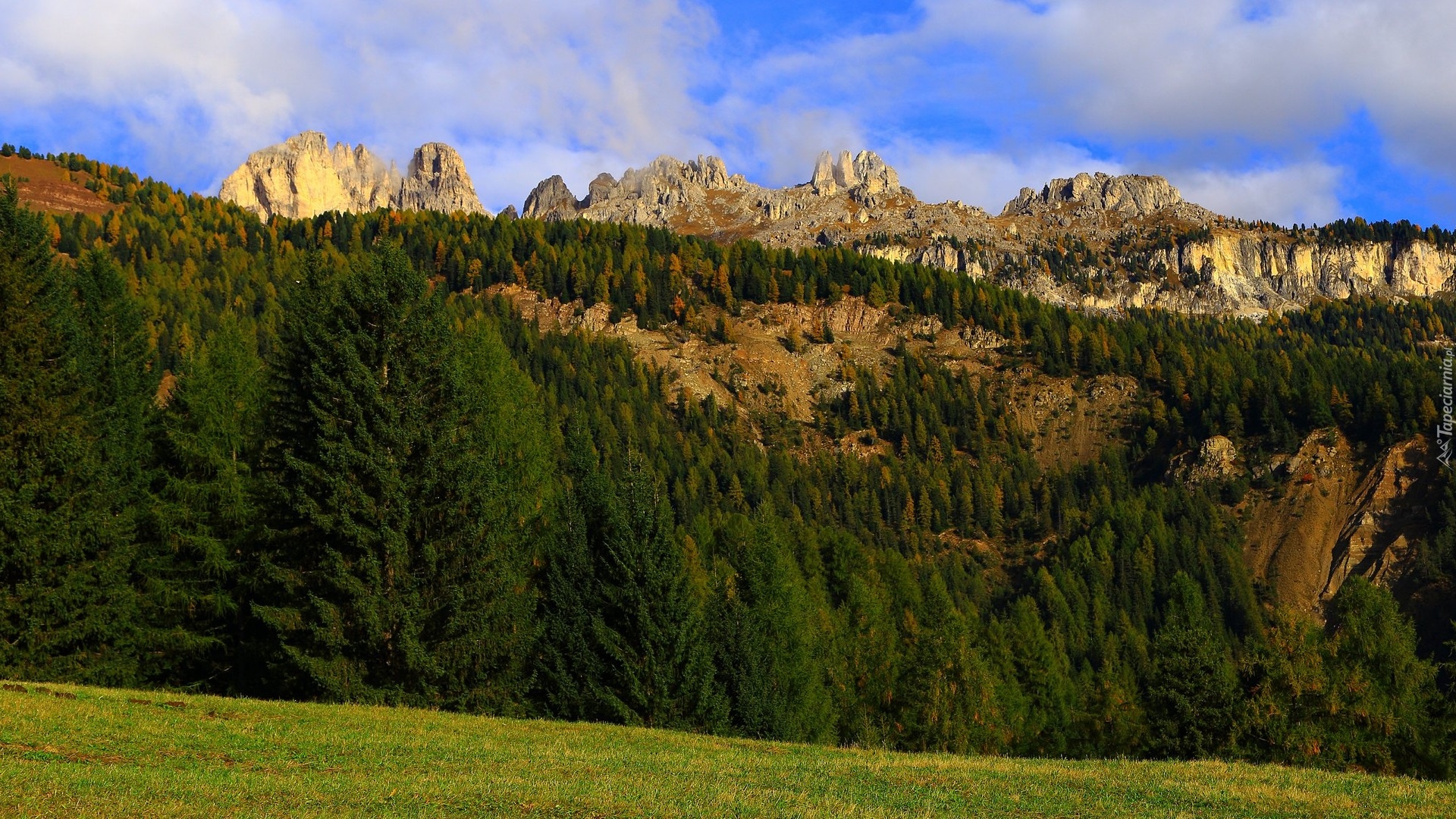 Edytor tapety: Świerki na tle skalistych szczytów gór