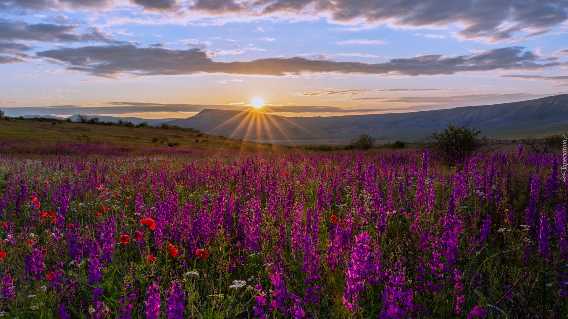 Edytor tapety: Promienie słońca padające na kwiatową łąkę