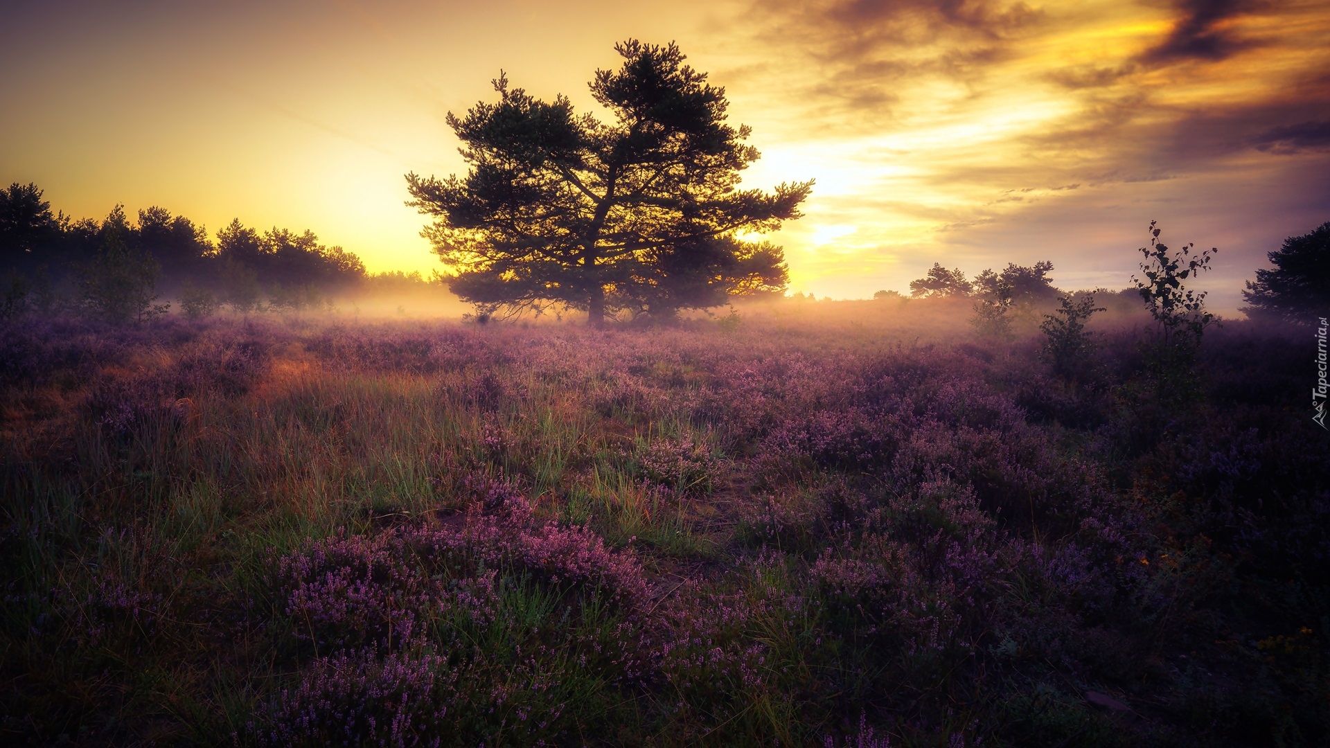Edytor tapety: Drzewo na wrzosowisku o wschodzie słońca
