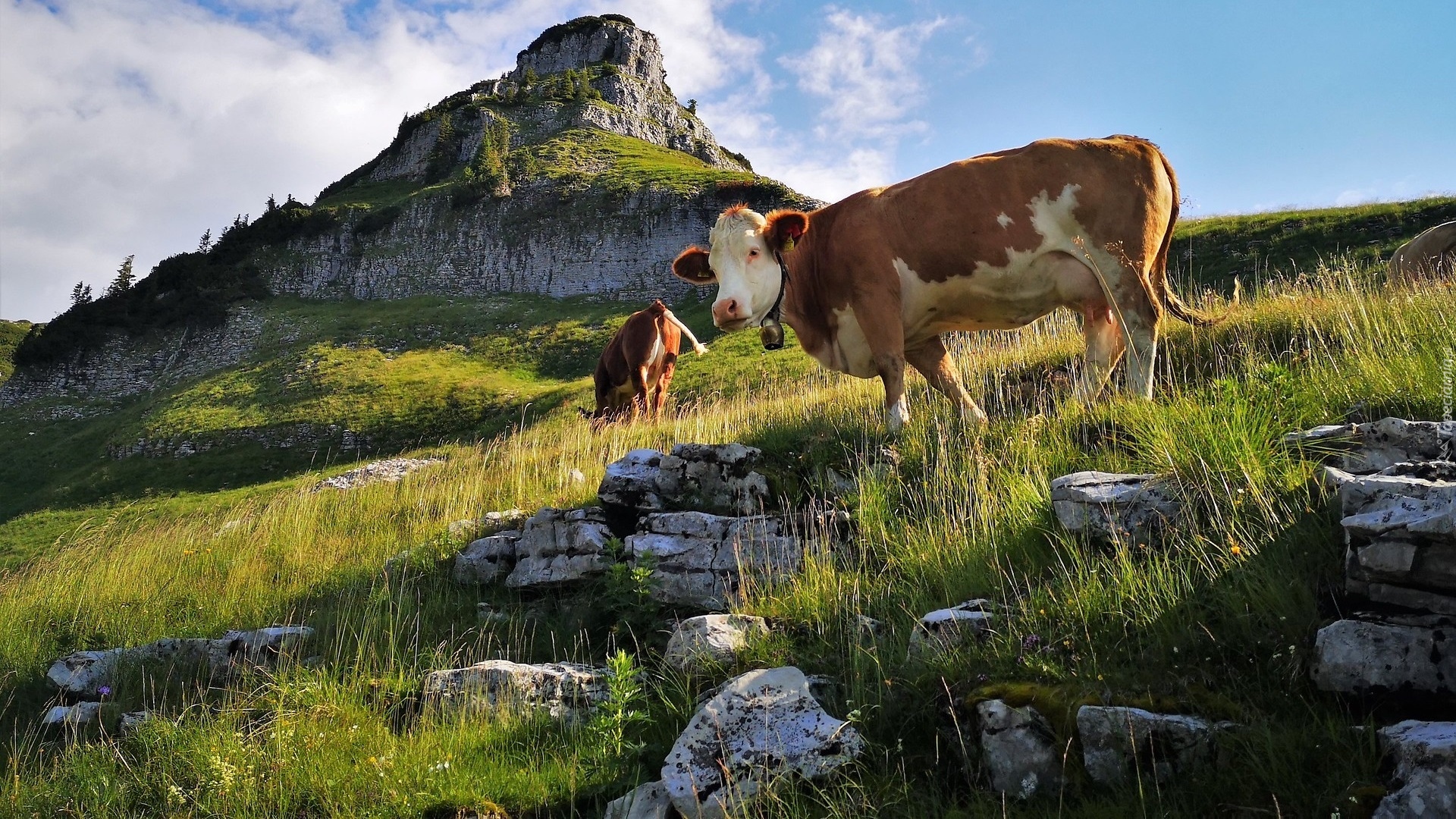 Edytor tapety: Krowy pasące się na górskiej polanie