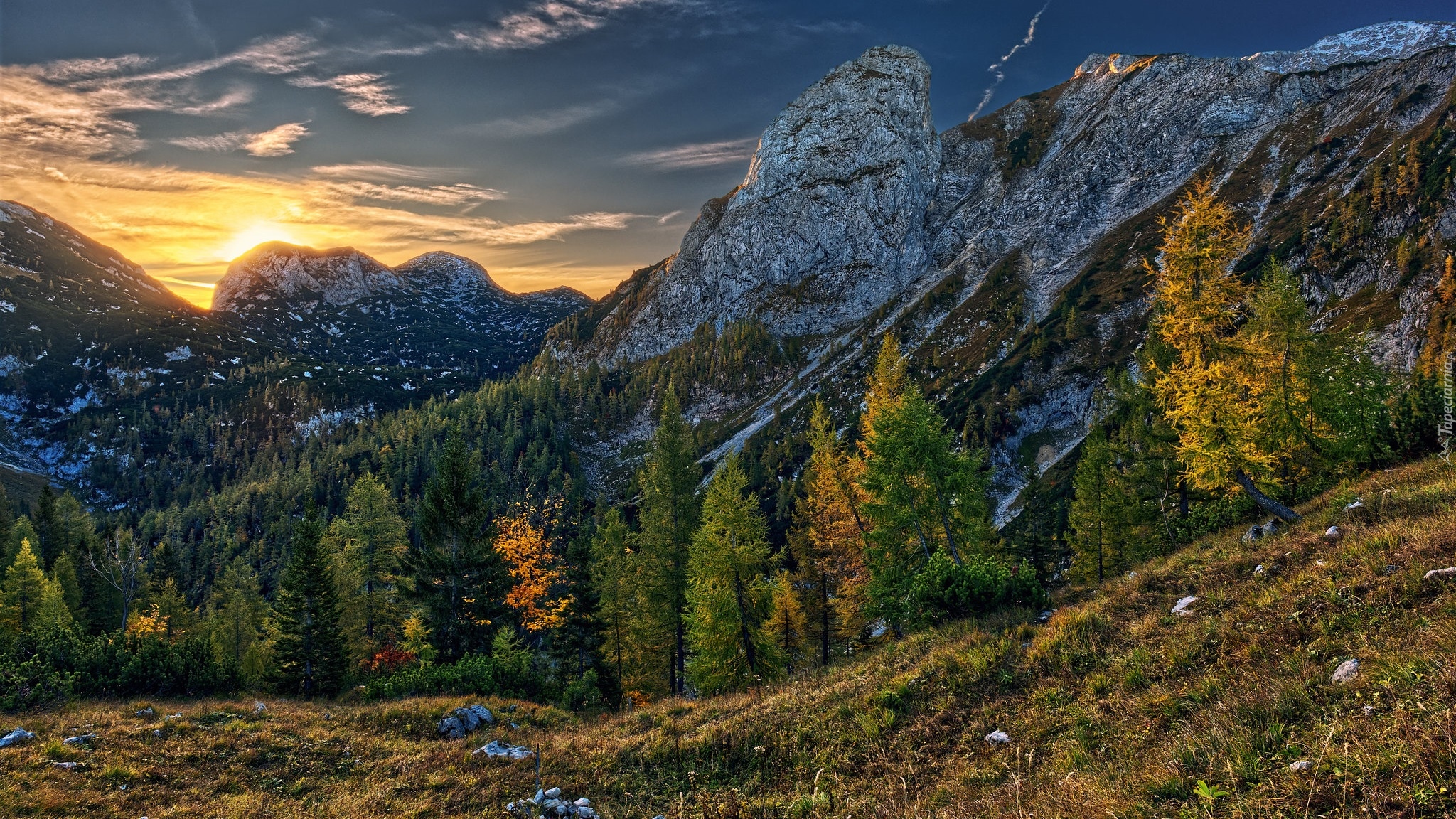 Edytor tapety: Wschód słońca nad skalistymi szczytami gór