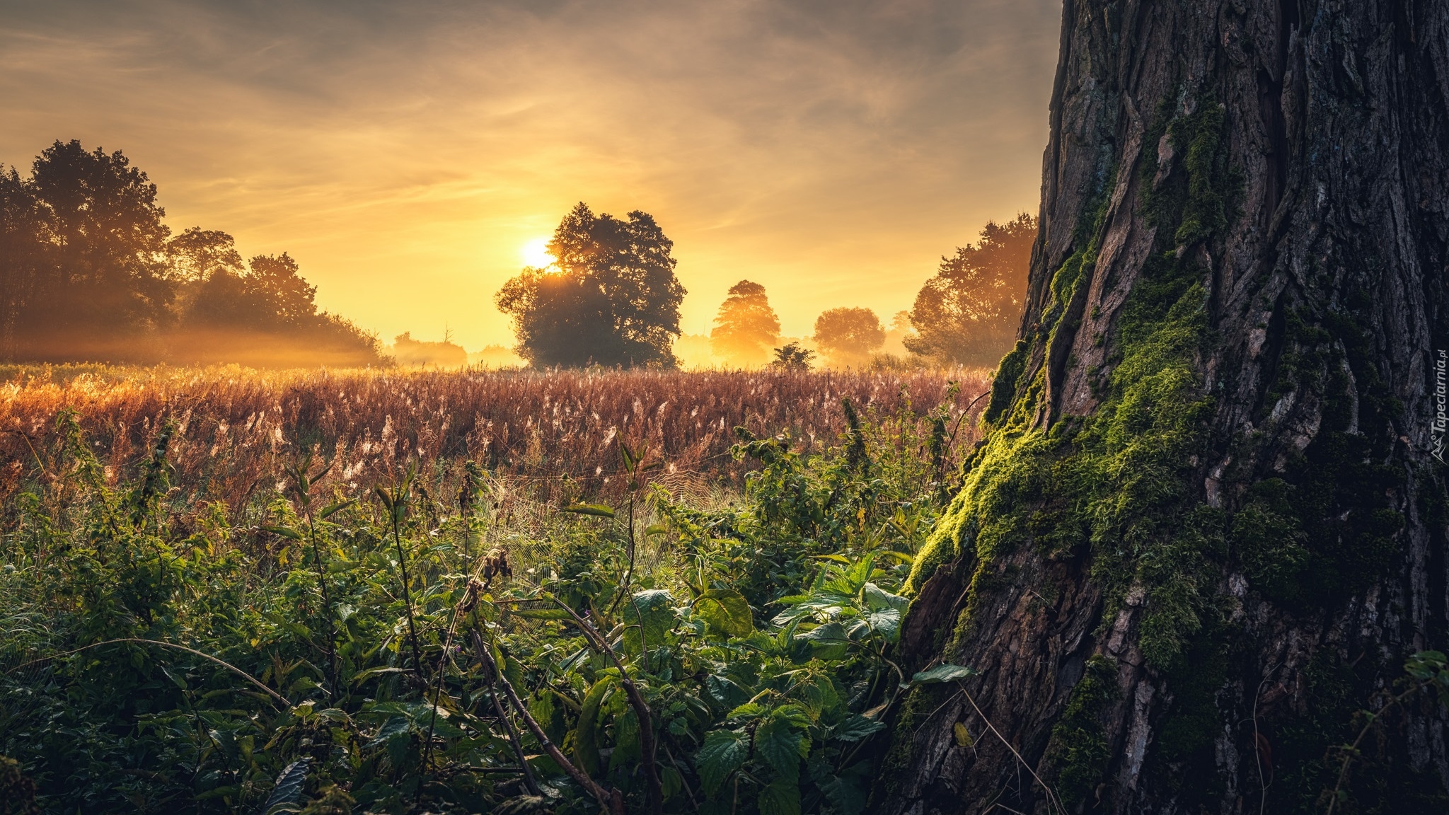 Edytor tapety: Wschodzące słońce nad zamgloną łąką