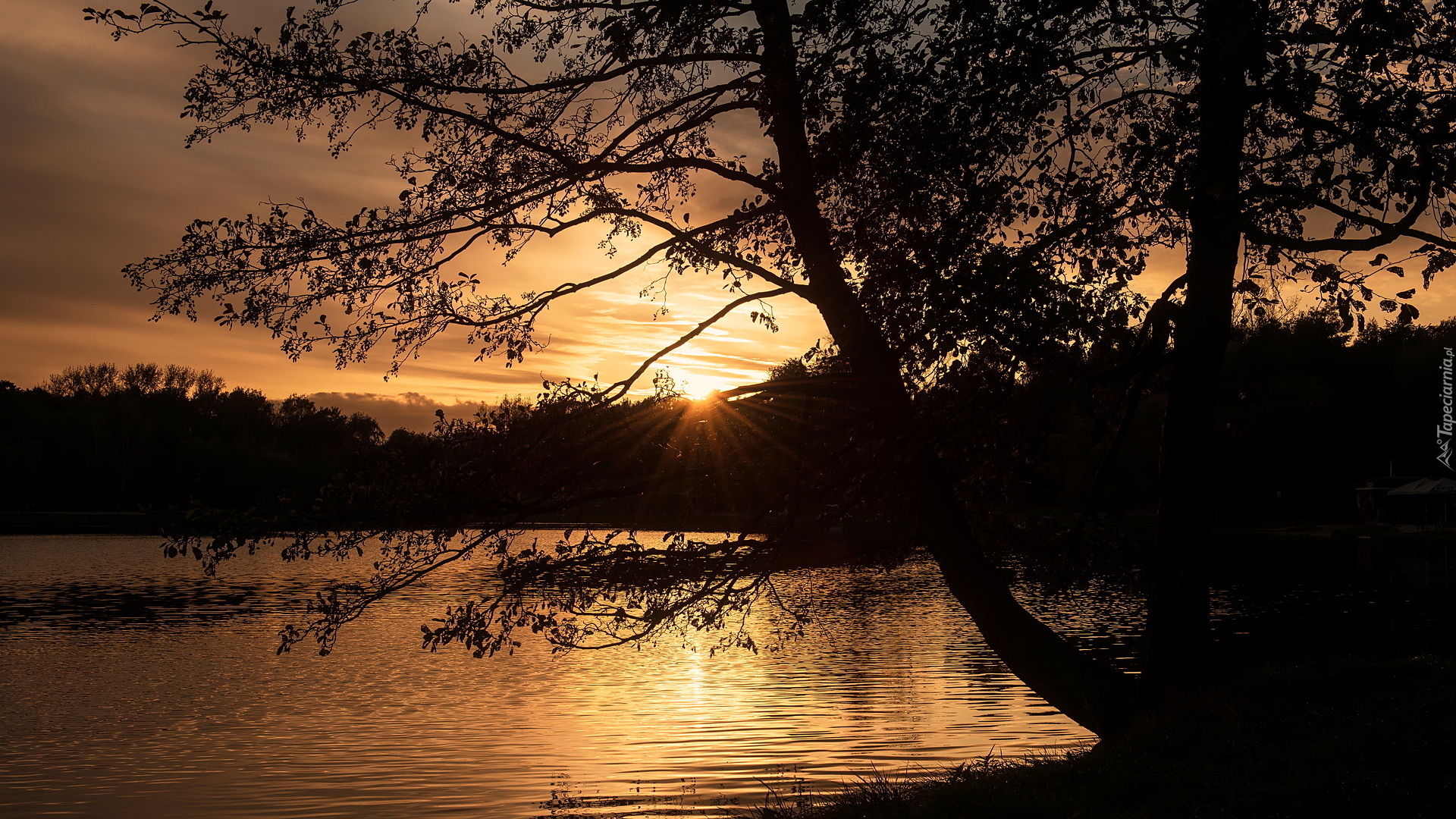 Edytor tapety: Drzewa nad stawem o zachodzie słońca