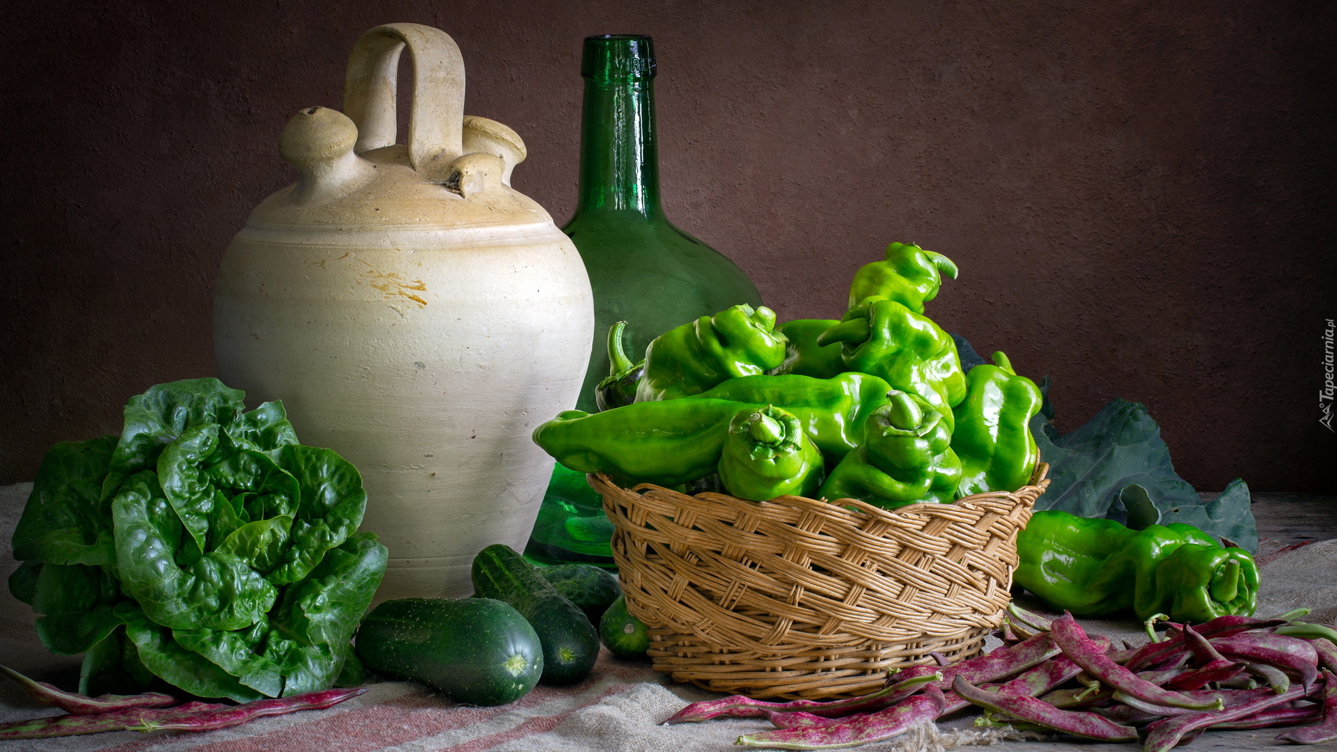 Edytor tapety: Zielone warzywa obok dzbanka i butli