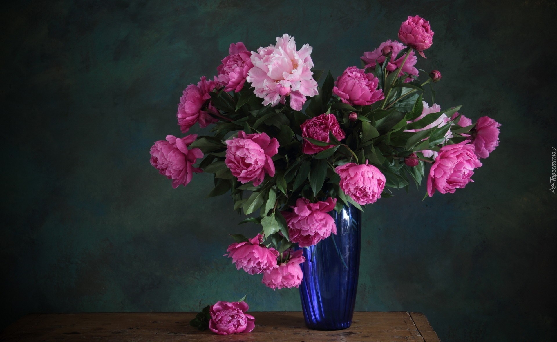 Edytor tapety: Różowe piwonie w niebieskim wazonie