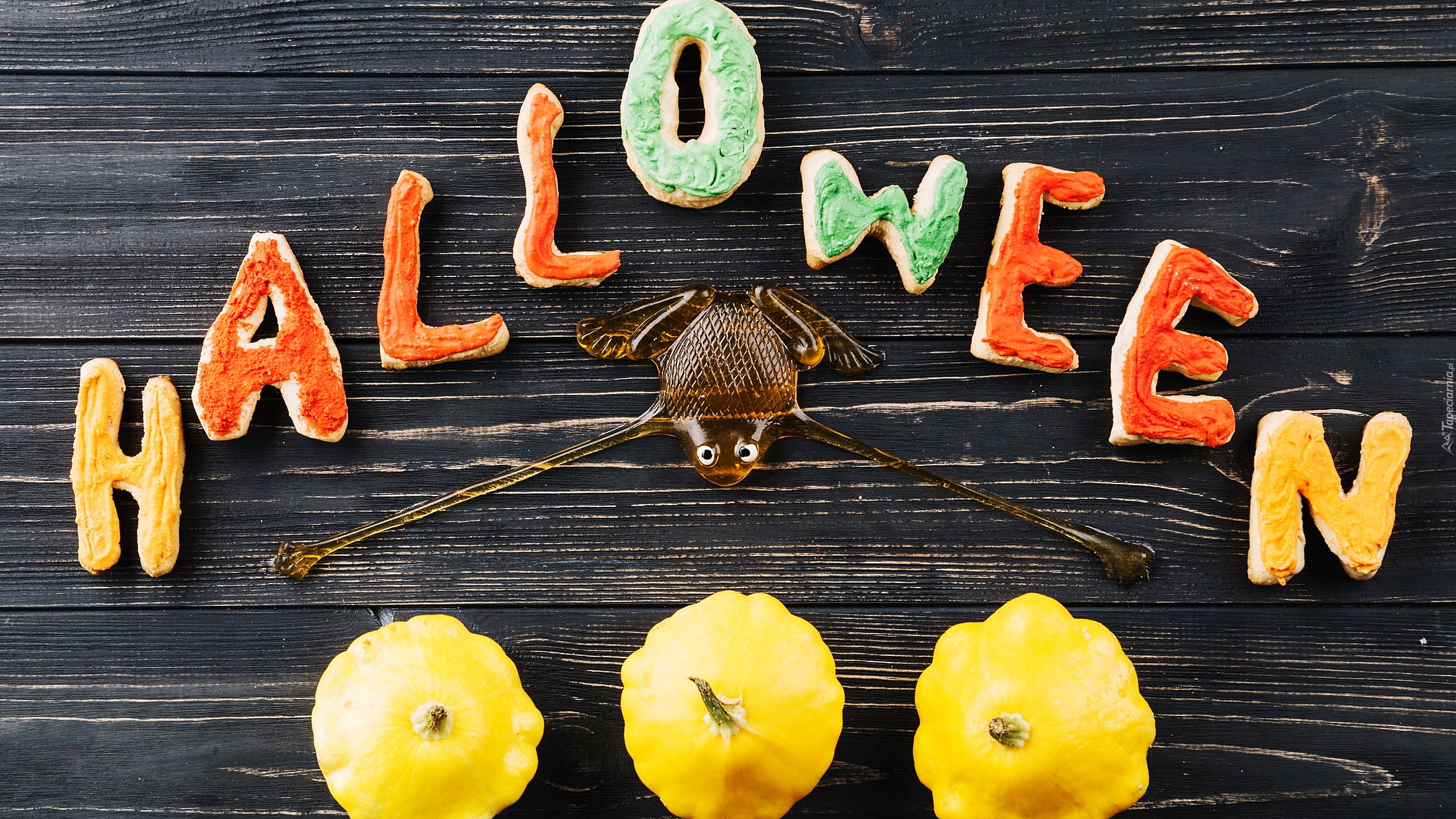 Edytor tapety: Żaba i dynie pod napisem Halloween z ciasteczek