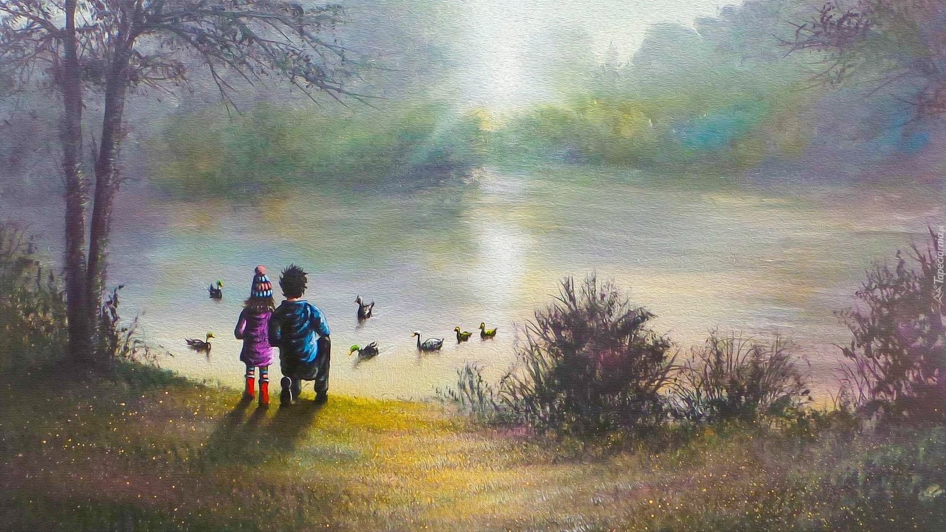 Edytor tapety: Dzieci karmiące kaczki pływające po stawie