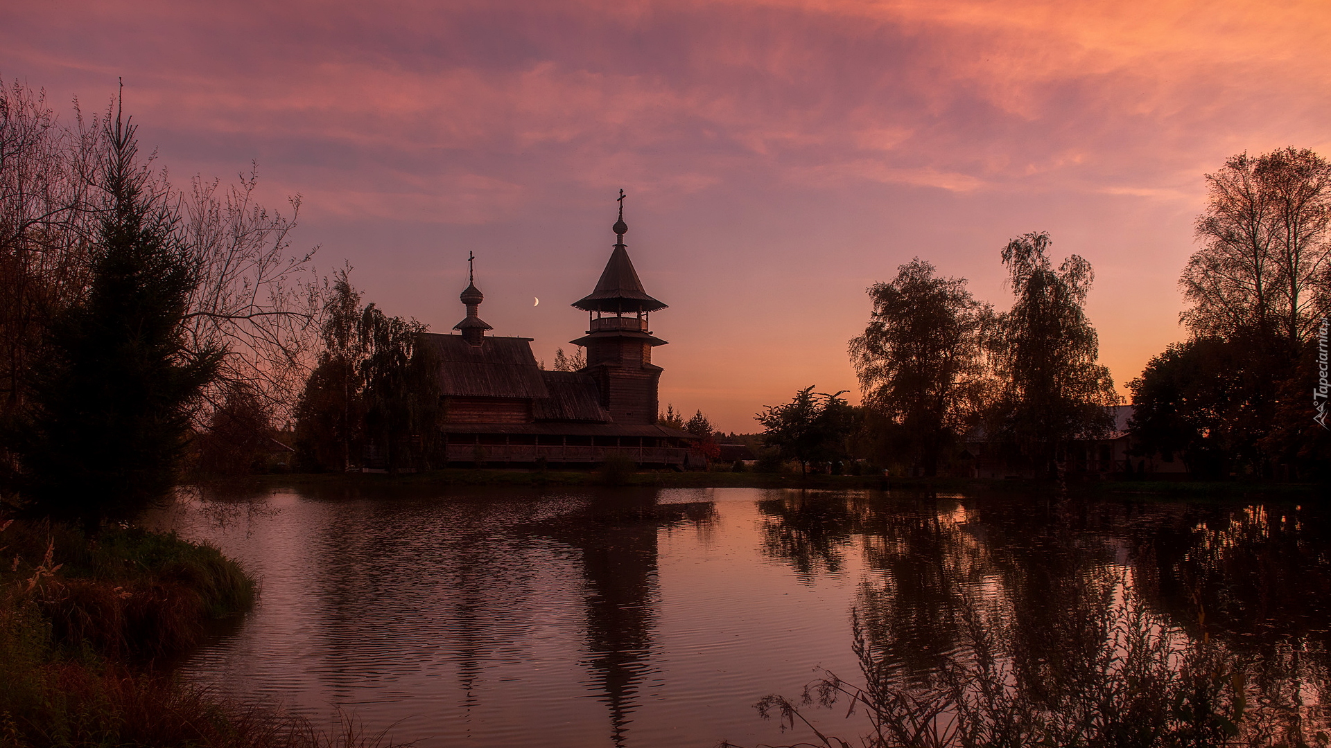 Edytor tapety: Cerkiew i drzewa nad jeziorem o zachodzie słońca