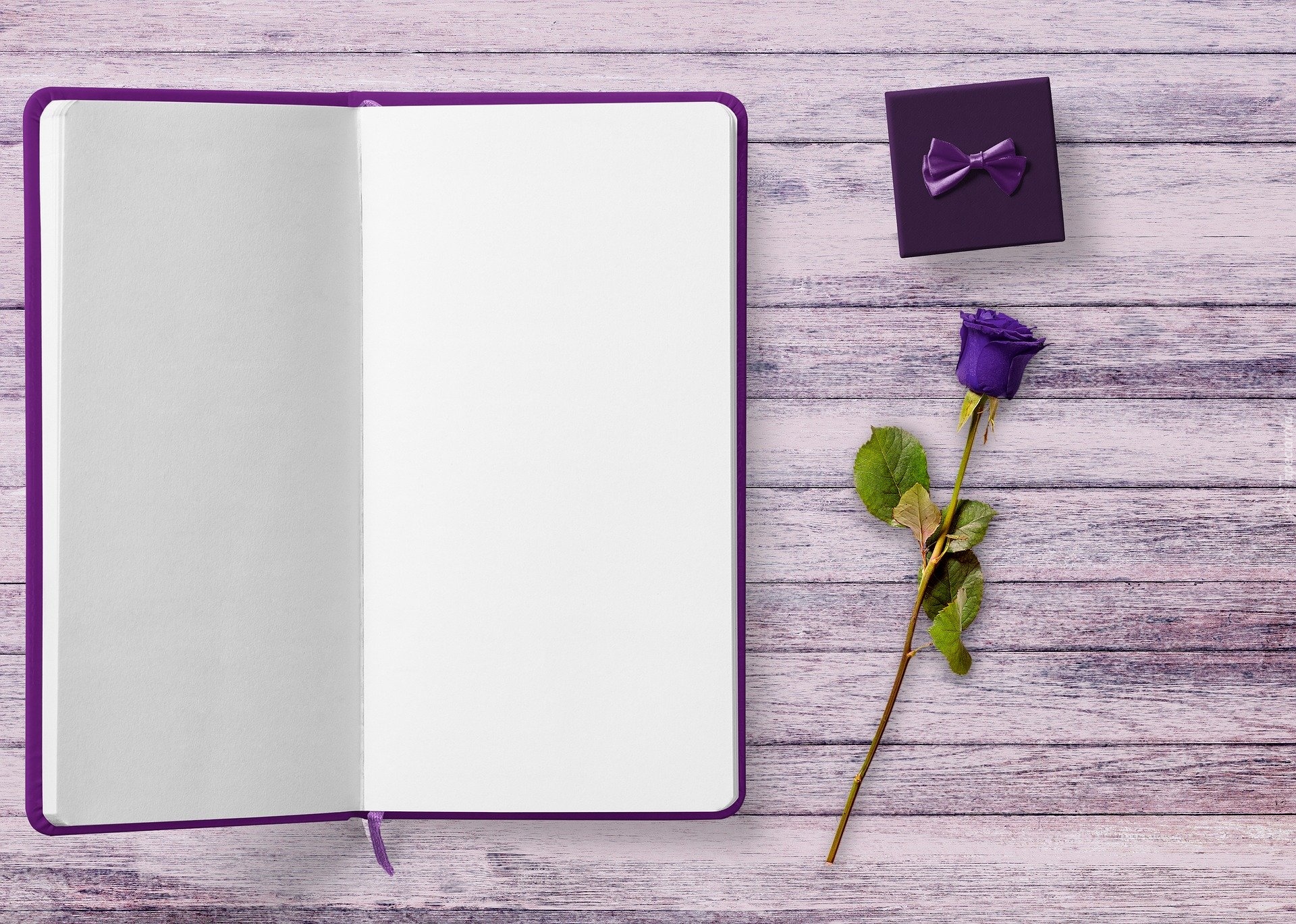 Edytor tapety: Notatnik obok prezentu i fioletowej róży