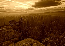 Edytor tapety: Widok ze skał na zachód słońca nad górami
