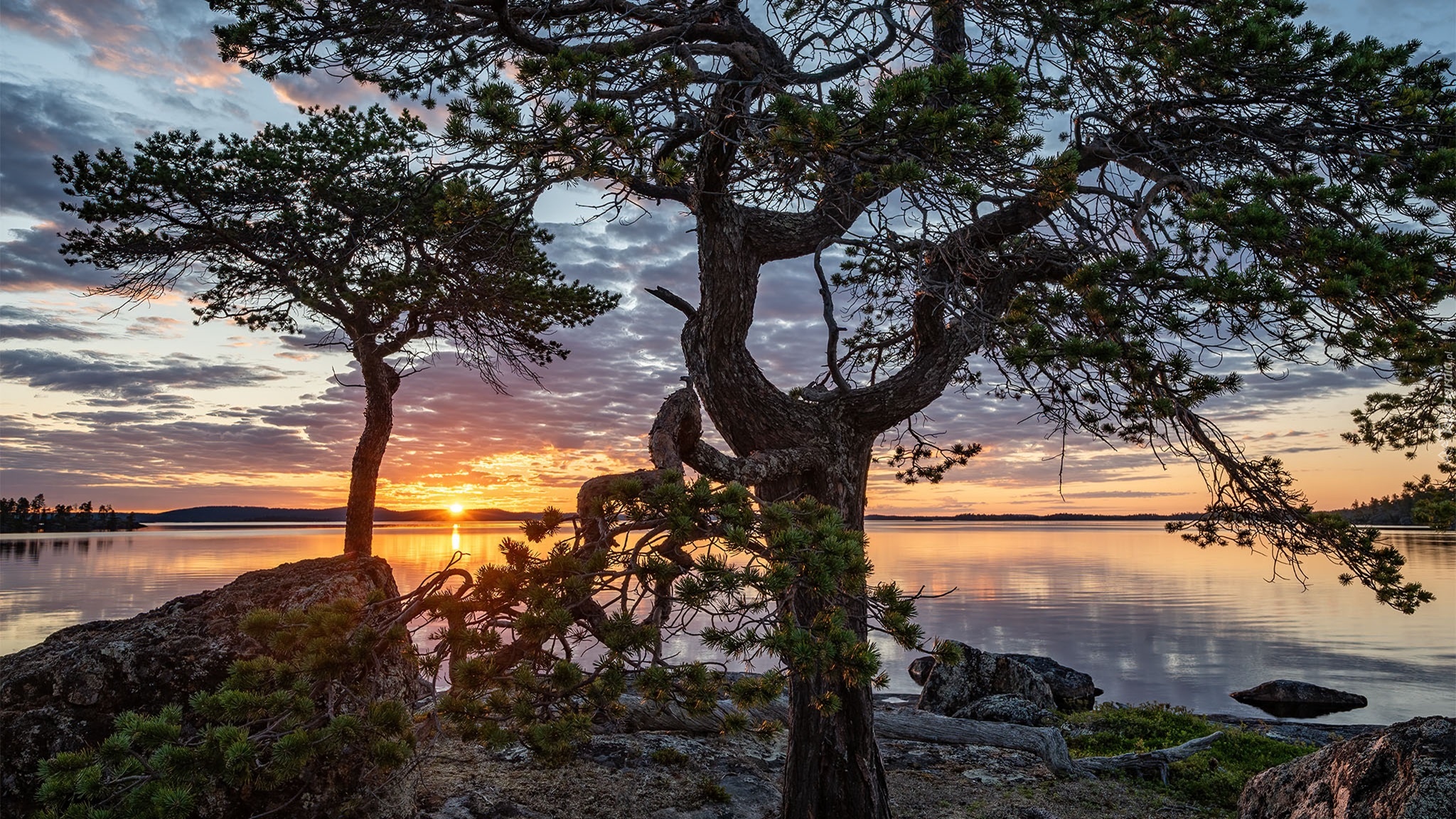 Edytor tapety: Drzewa na skałach nad jeziorem Inari w Finlandii
