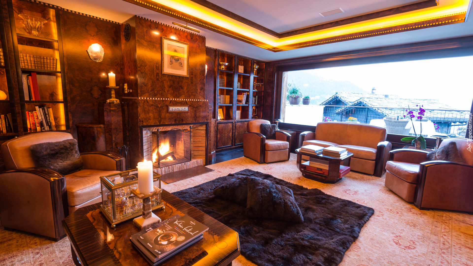 Edytor tapety: Skórzane fotele i kanapa w salonie z kominkiem