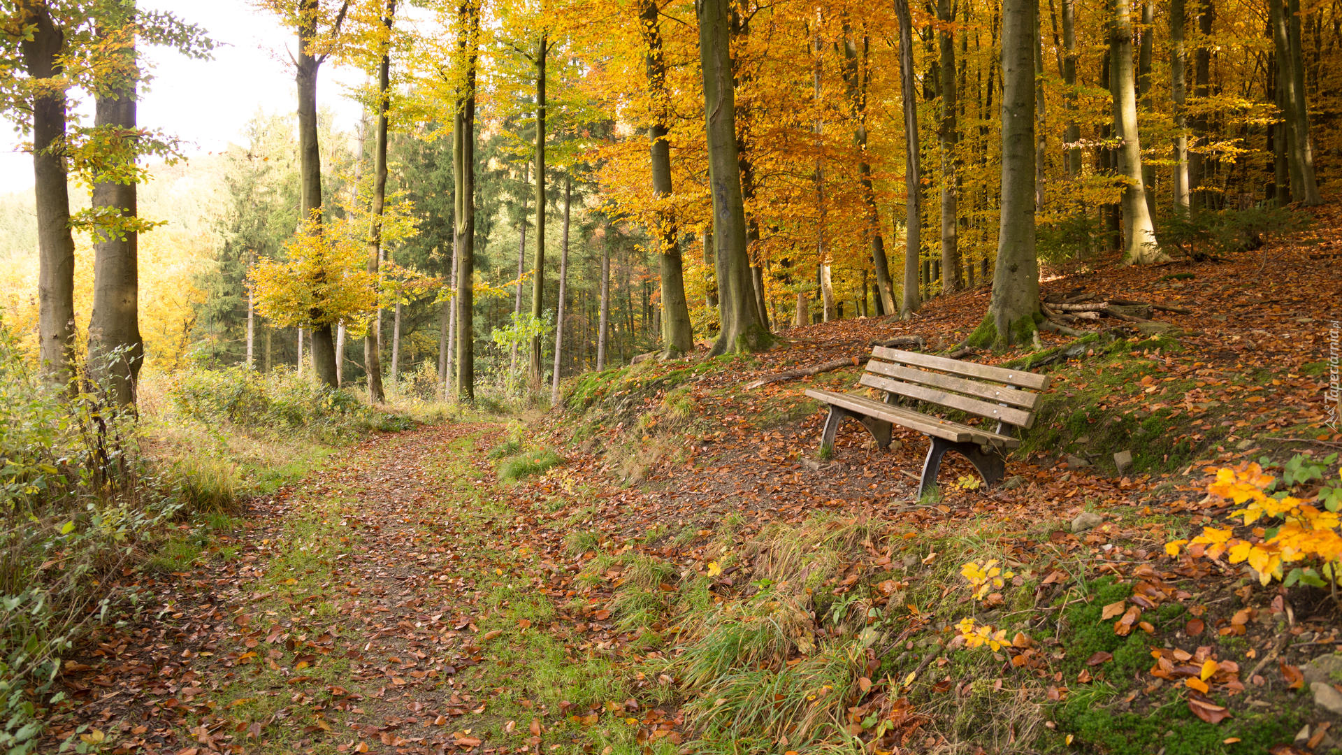 Edytor tapety: Ławka przy leśnej drodze