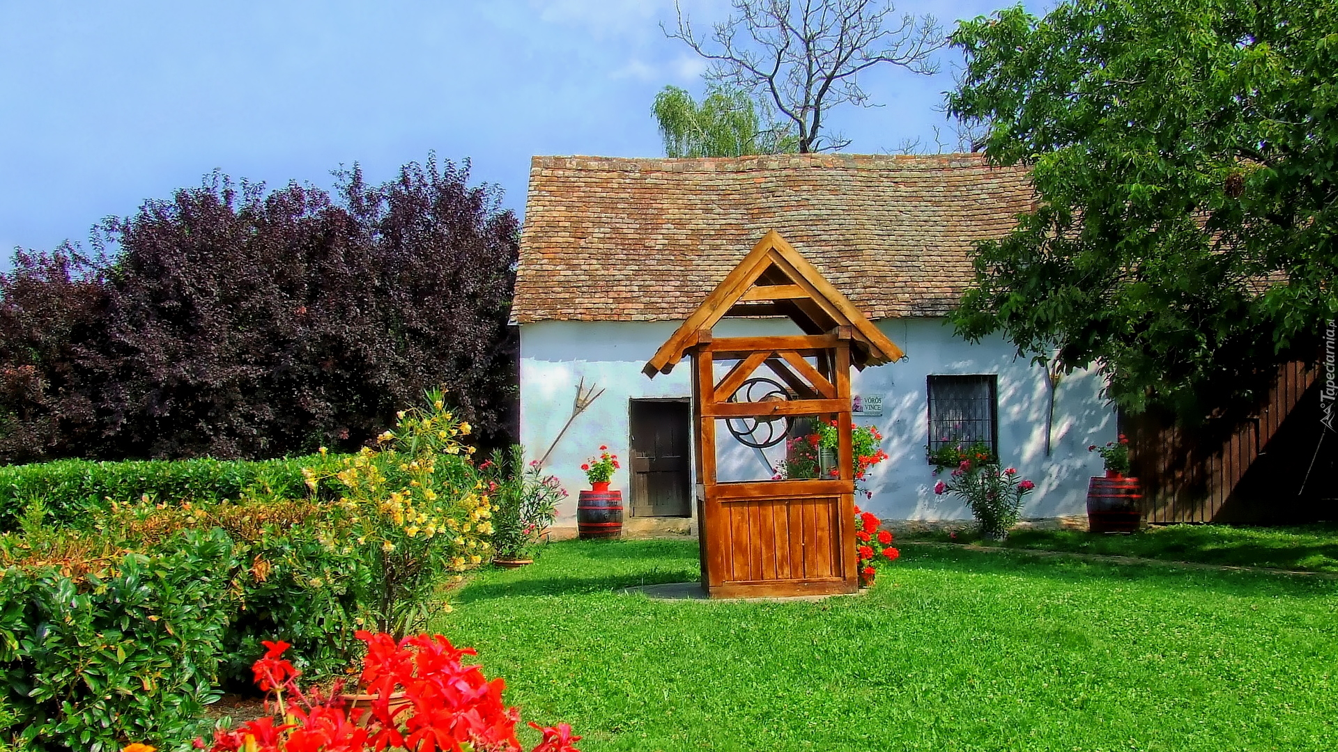 Edytor tapety: Studnia przy wiejskiej chacie w ogrodzie