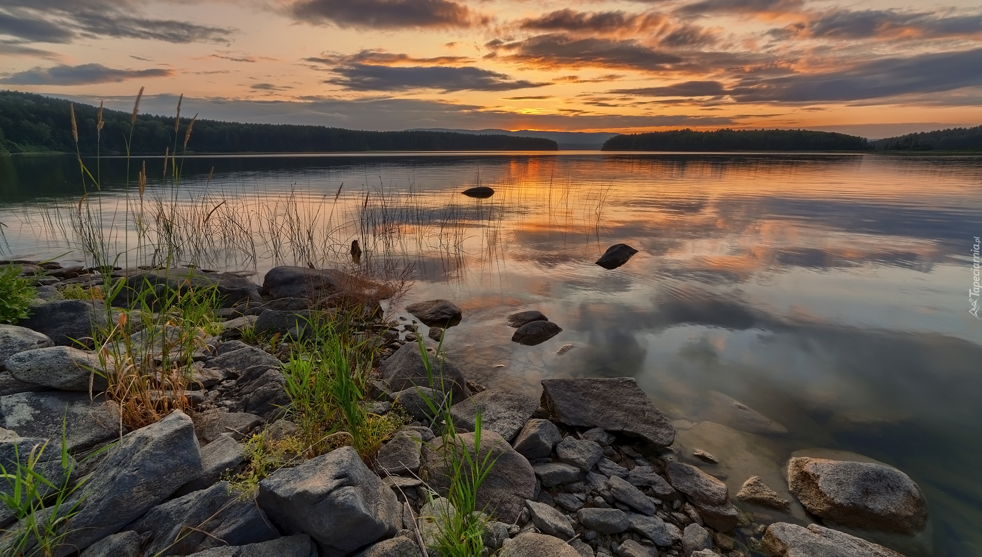 Edytor tapety: Trawa pomiędzy kamieniami na brzegu jeziora