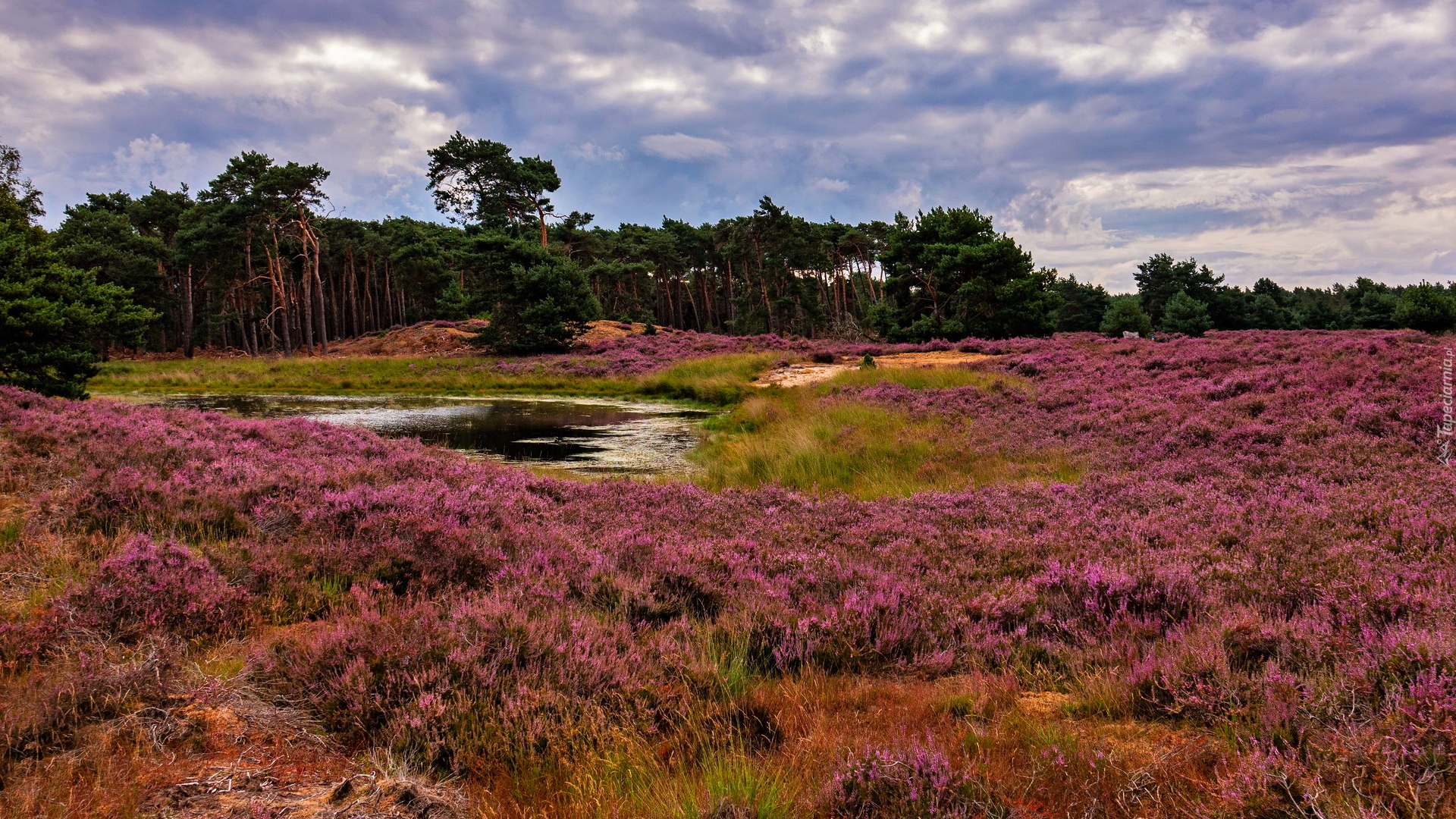 Edytor tapety: Wrzosowisko i drzewa nad stawem