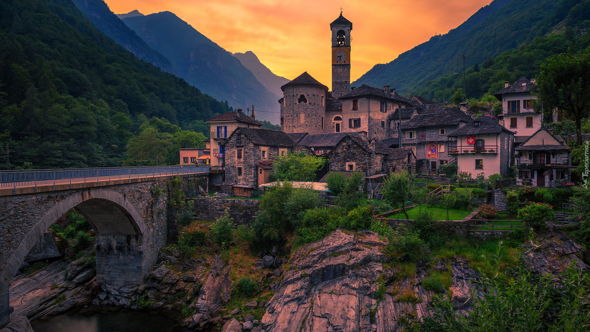Edytor tapety: Domy i kościół obok mostu w Lavertezzo