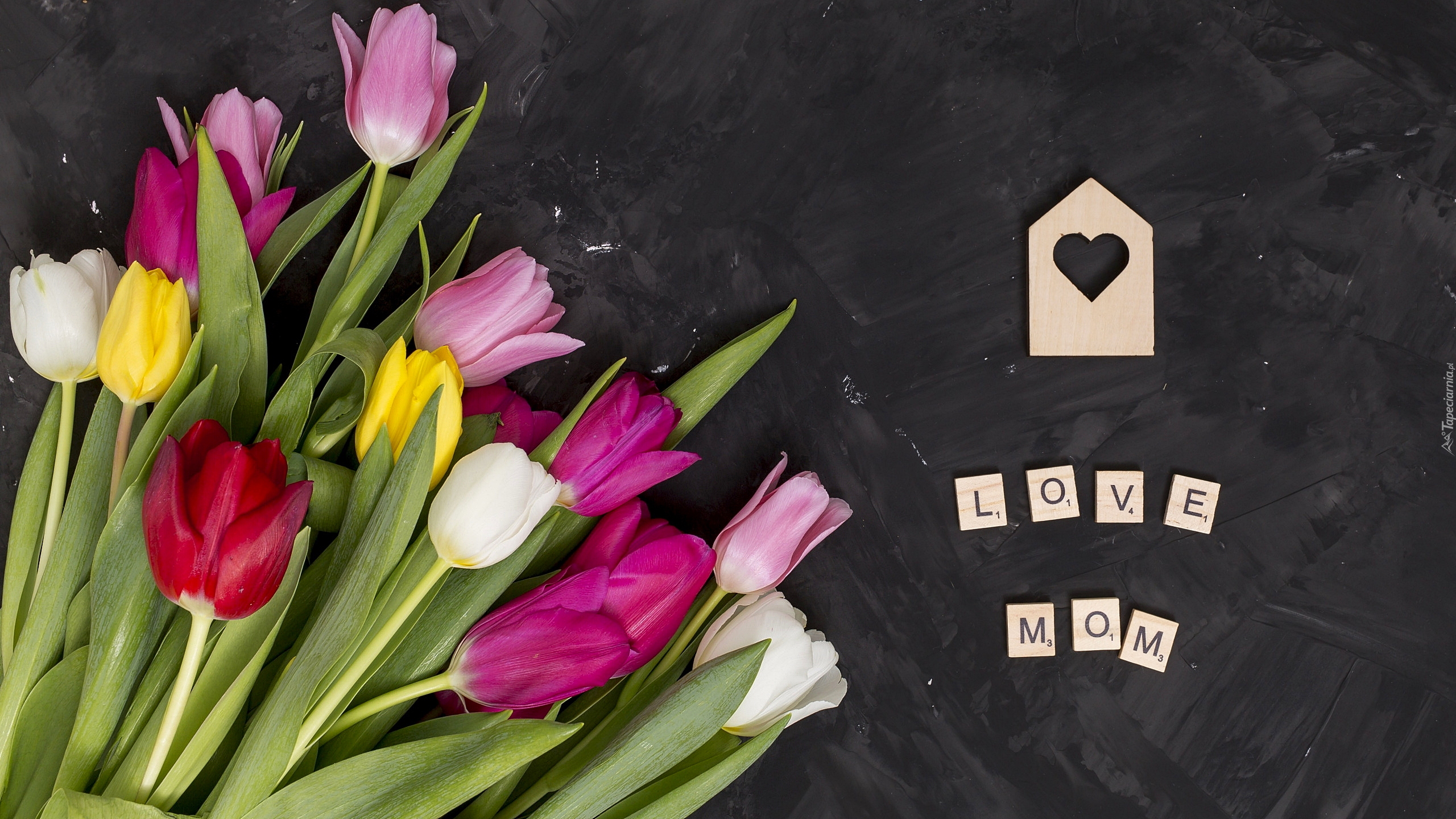 Edytor tapety: Tulipany na ciemnym tle obok napisu Love mom
