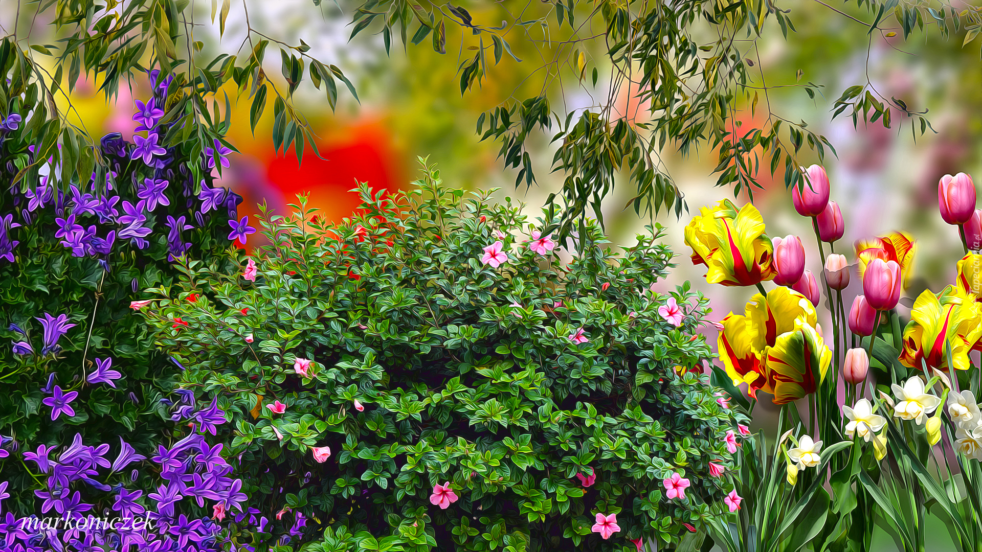 Edytor tapety: Kwitnący krzew pośród tulipanów i narcyzów w grafice