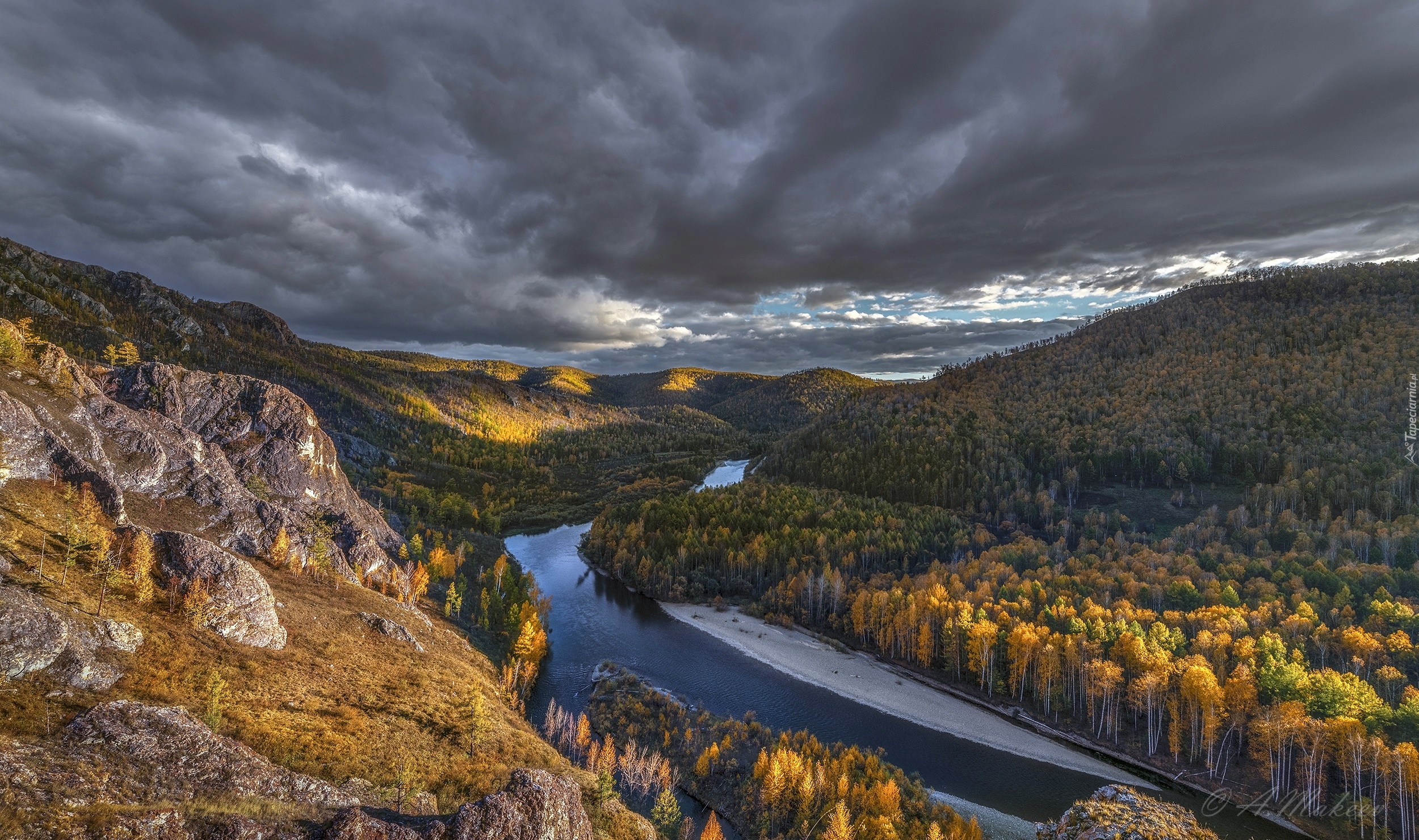 Edytor tapety: Ciemne chmury nad rzeką w dolinie