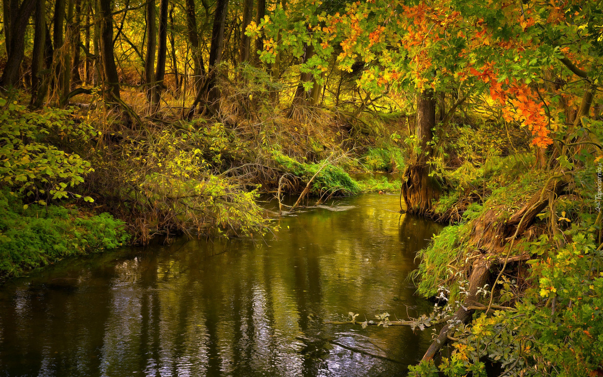 Edytor tapety: Rzeka pośród drzew i krzewów