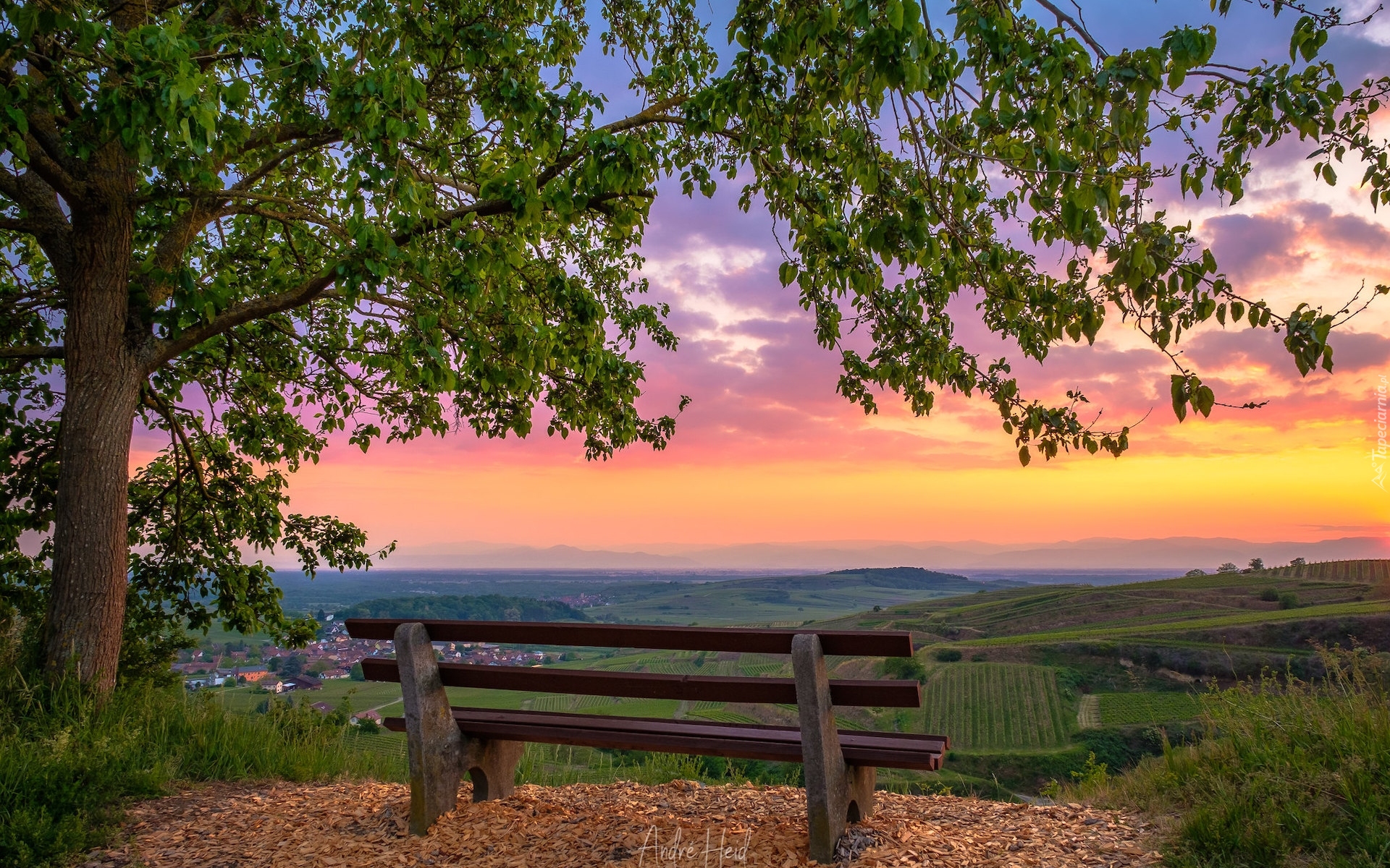 Edytor tapety: Ławka pod drzewem z widokiem na wzgórza Kaiserstuhl