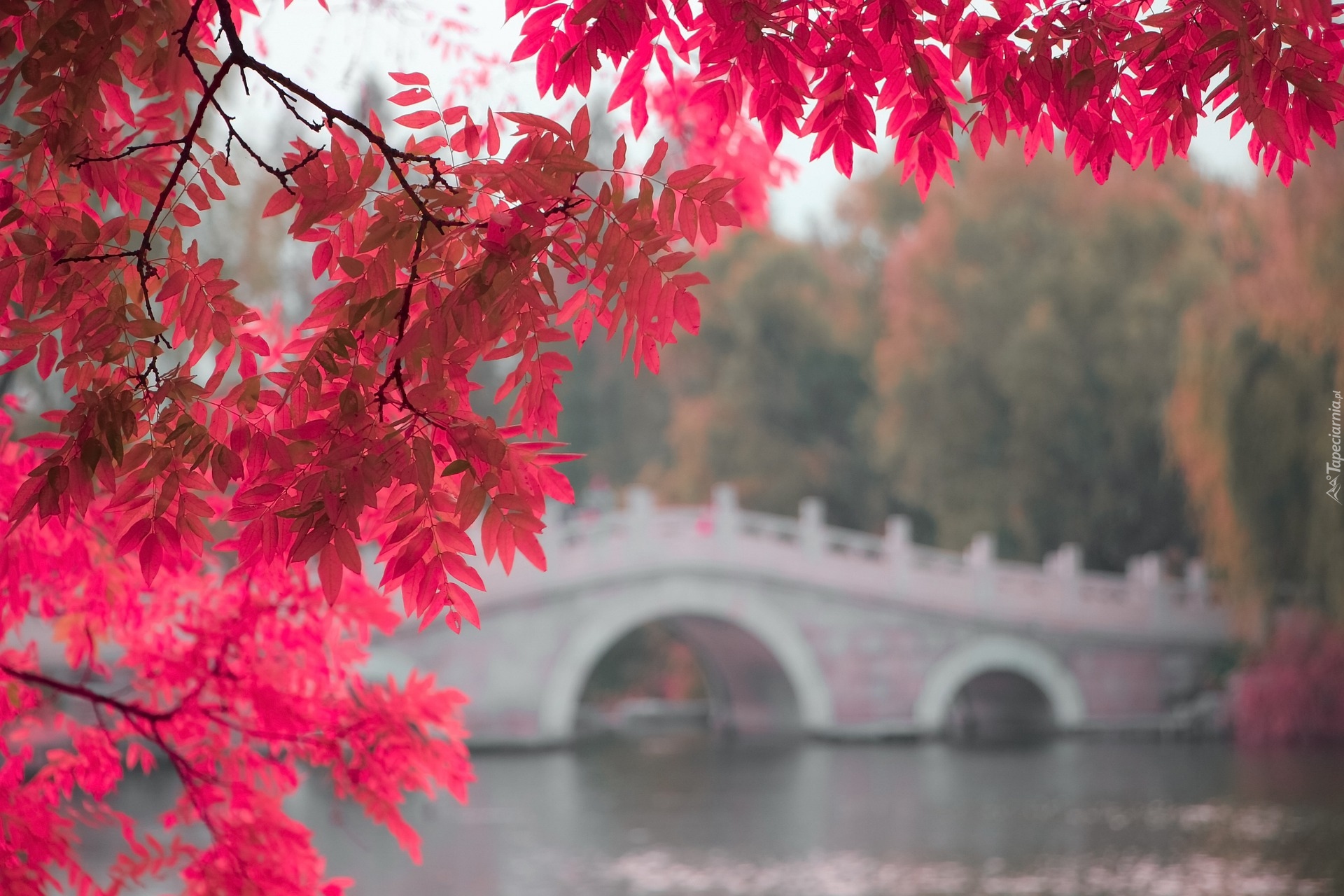 Edytor tapety: Czerwone liście na tle mostu nad rzeką