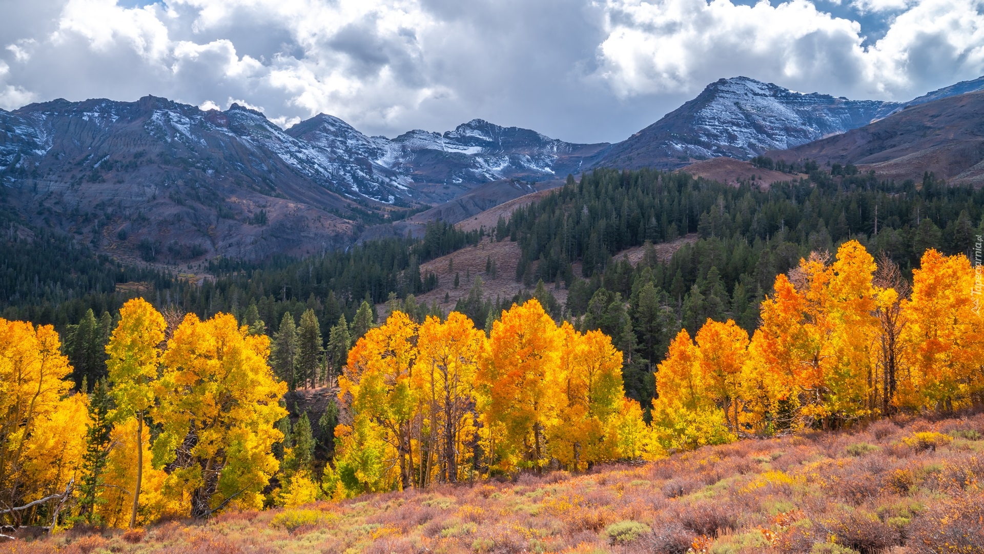 Edytor tapety: Jesienne drzewa na tle gór w Kalifornii