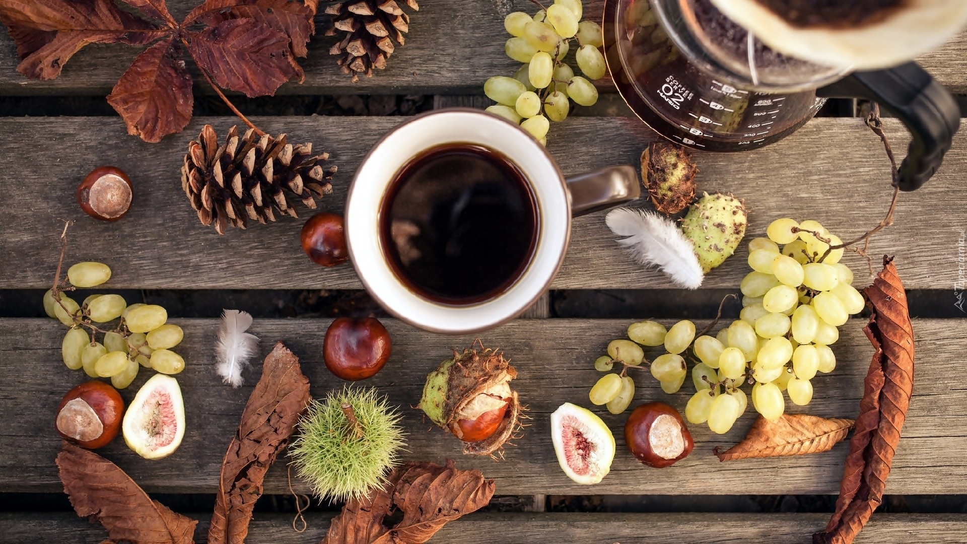 Edytor tapety: Filiżanka kawy z dzbankiem pośród kasztanów i szyszek