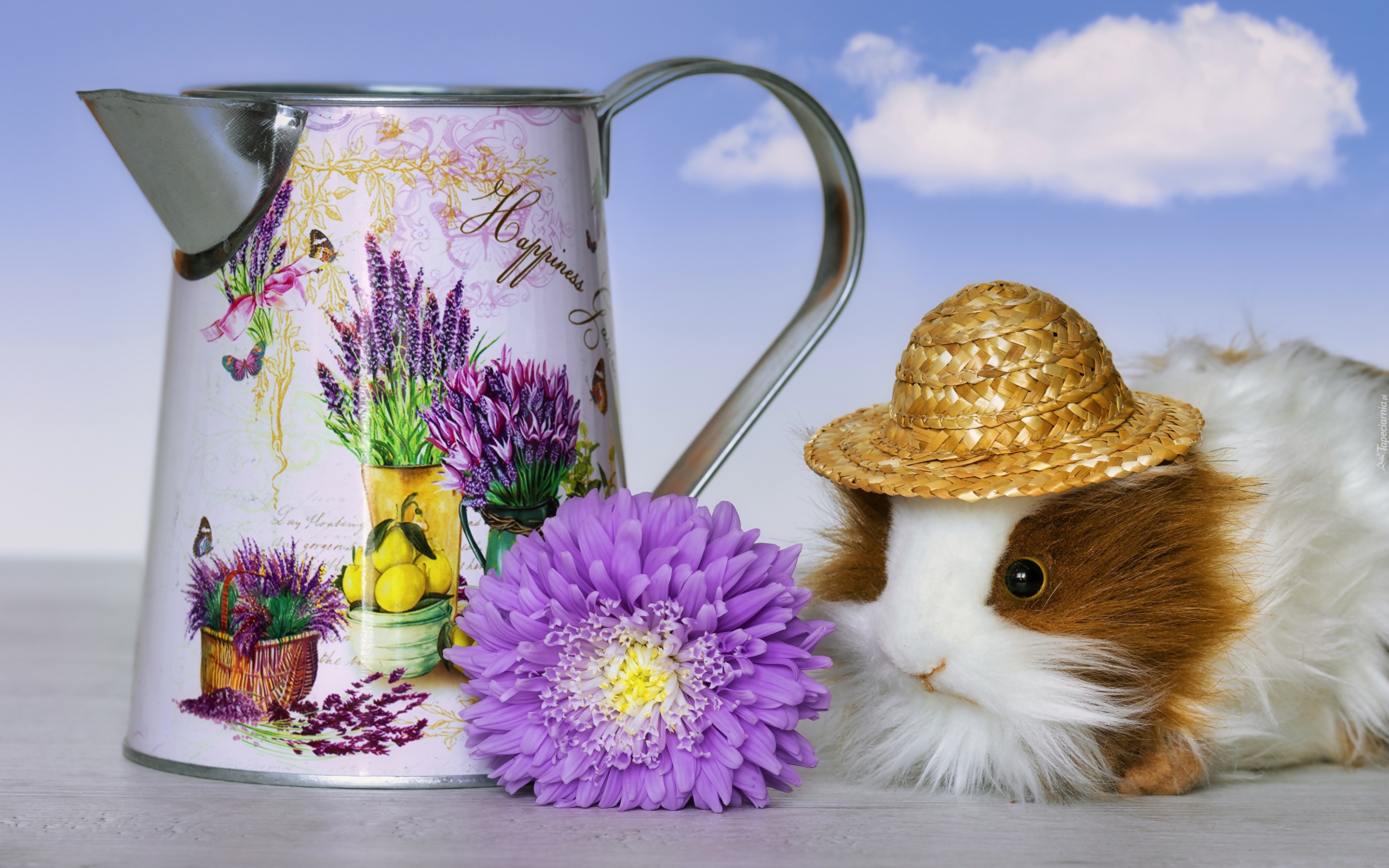 Edytor tapety: Świnka morska w kapeluszu przy malowanym dzbanku